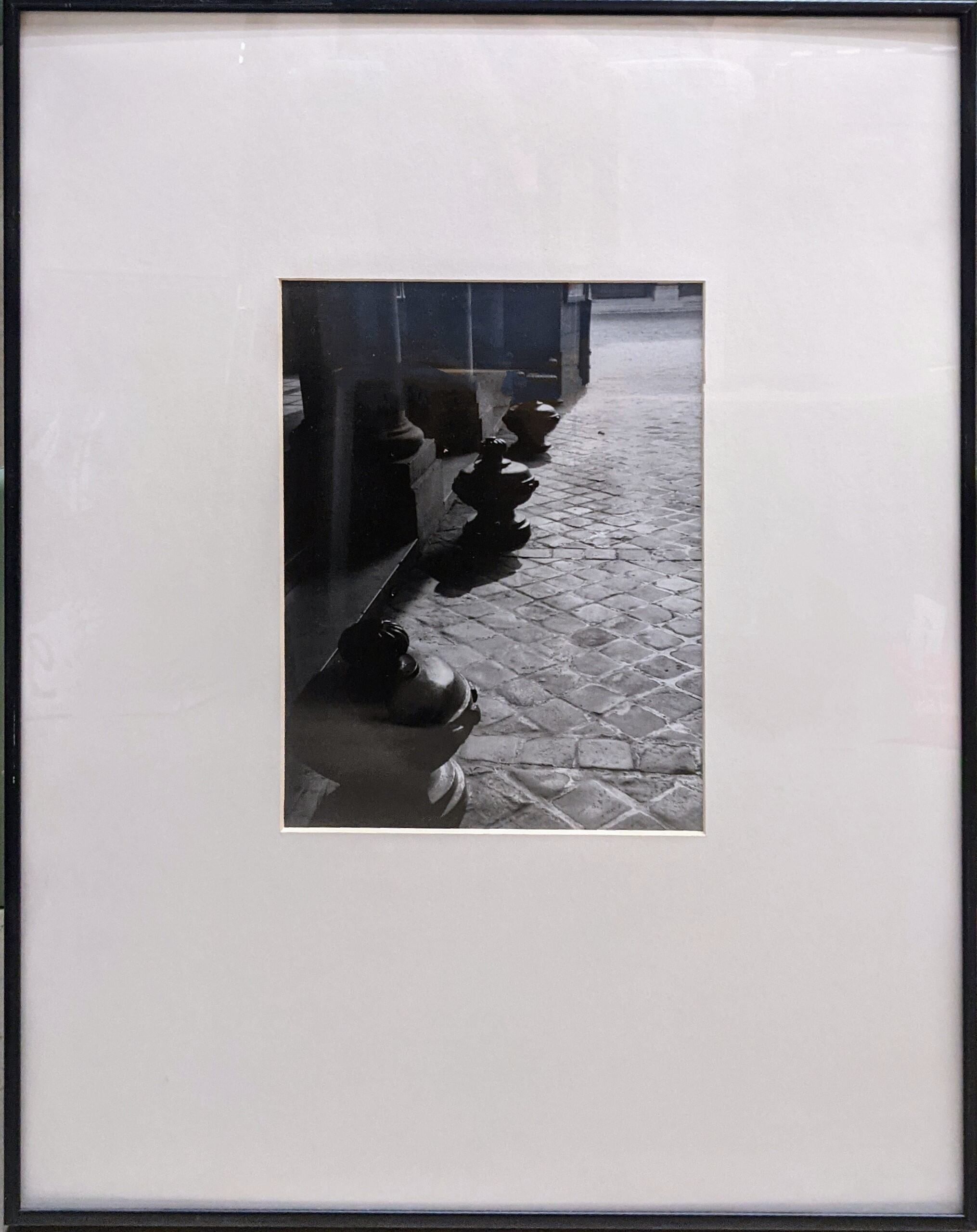 An image of repeated architectural forms in front of column bases set in a modern black metal frame with a mat and glazing.Photograph Details
