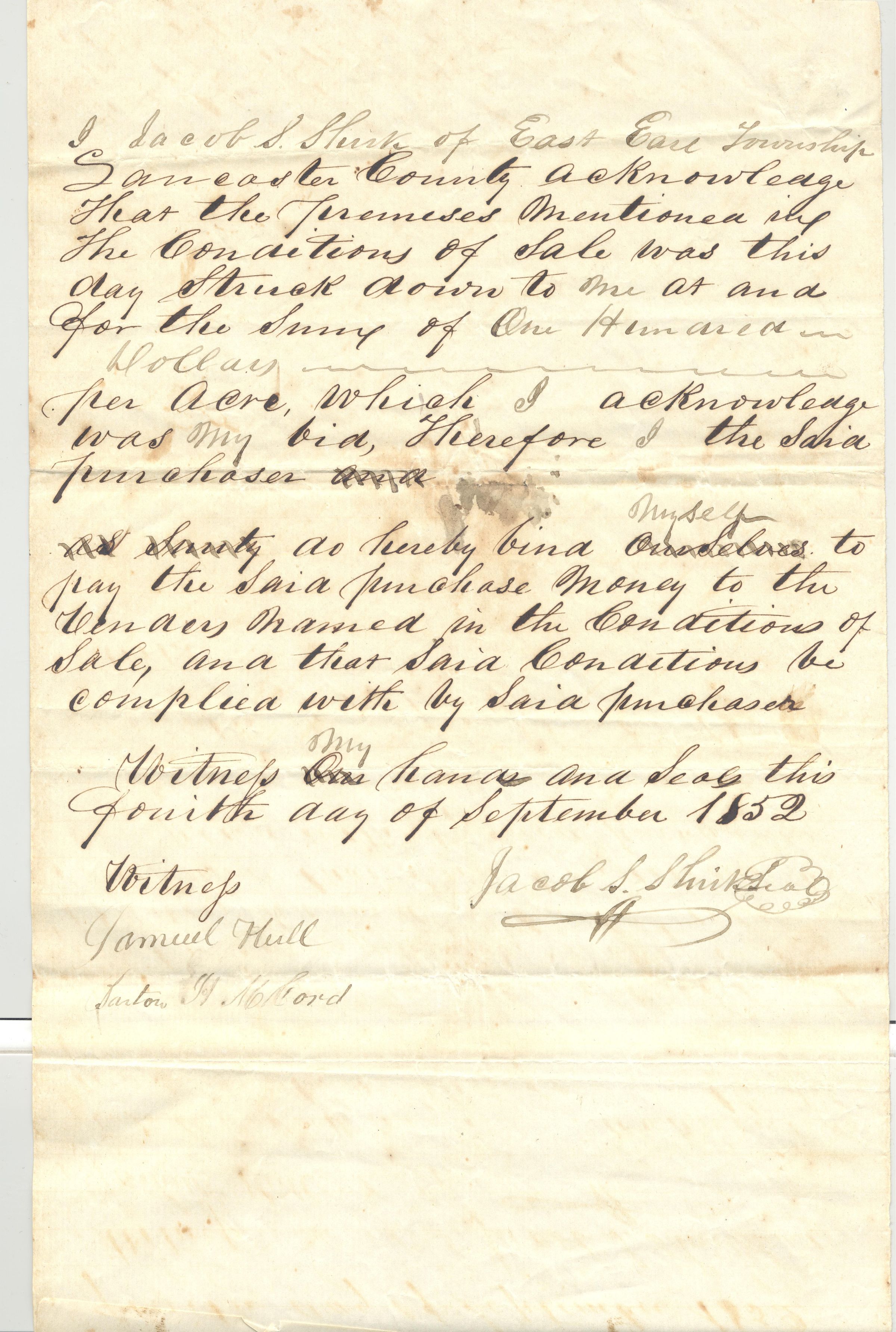 LETTER, BIDDER CONTRACT, 1852, EAST EARL TOWNSHIP, PAPER. LANCASTER COUNTY