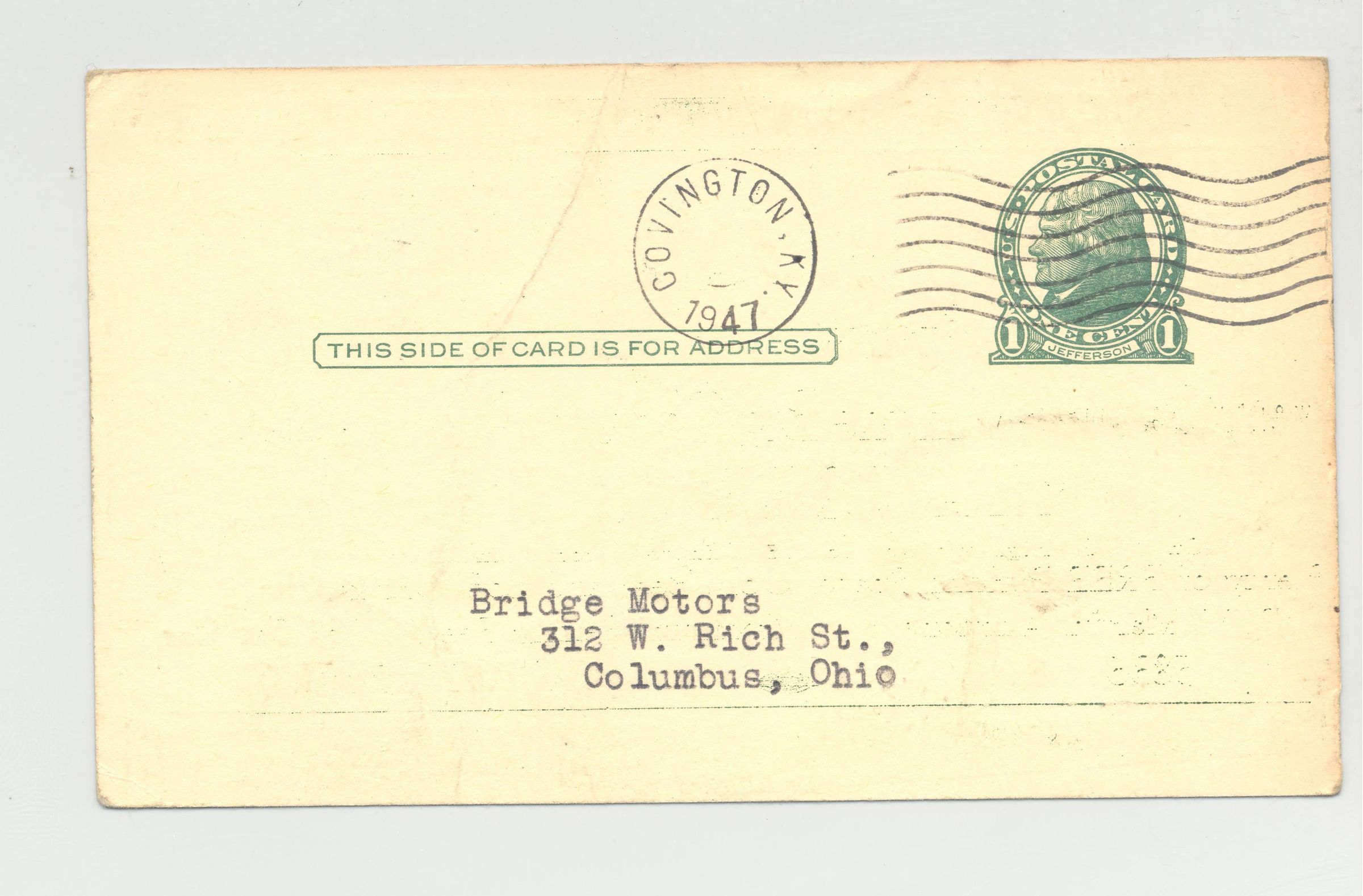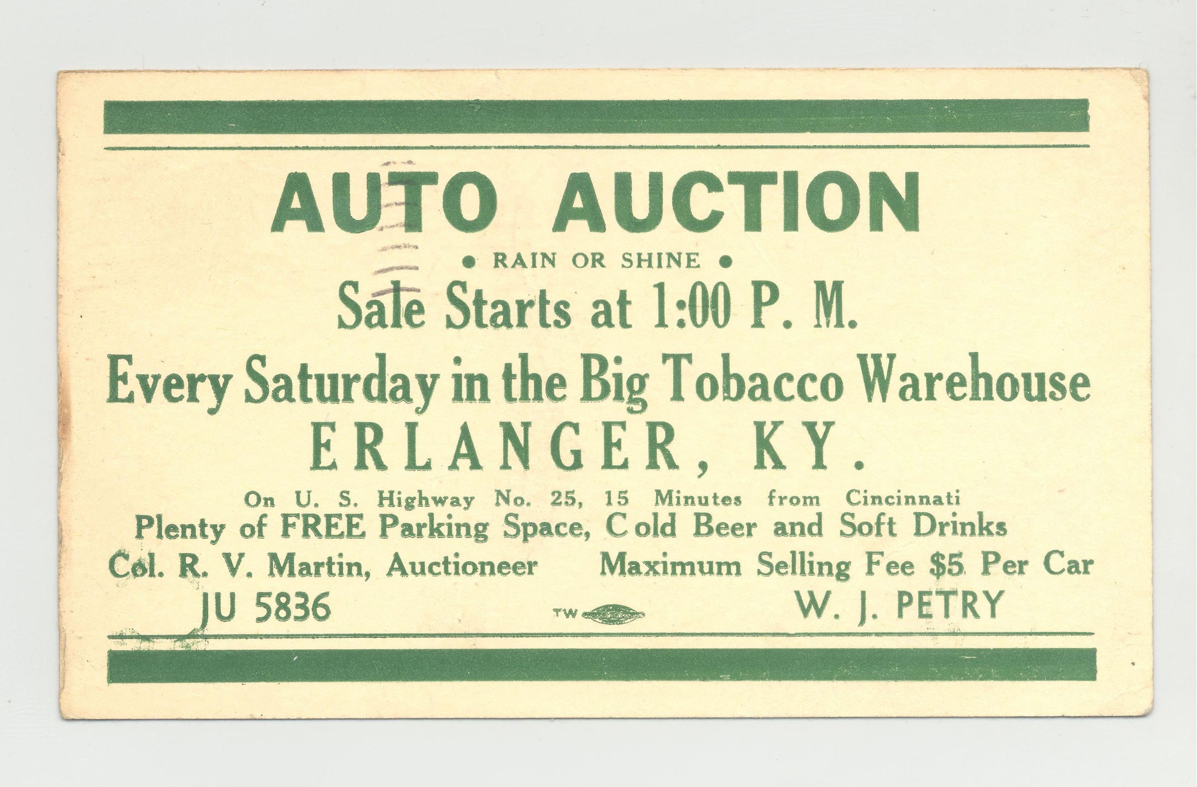 PSTCD, AUTO, 1947, ERLANGER, KY. COL. R.V. MARTIN, AUCTIONEER