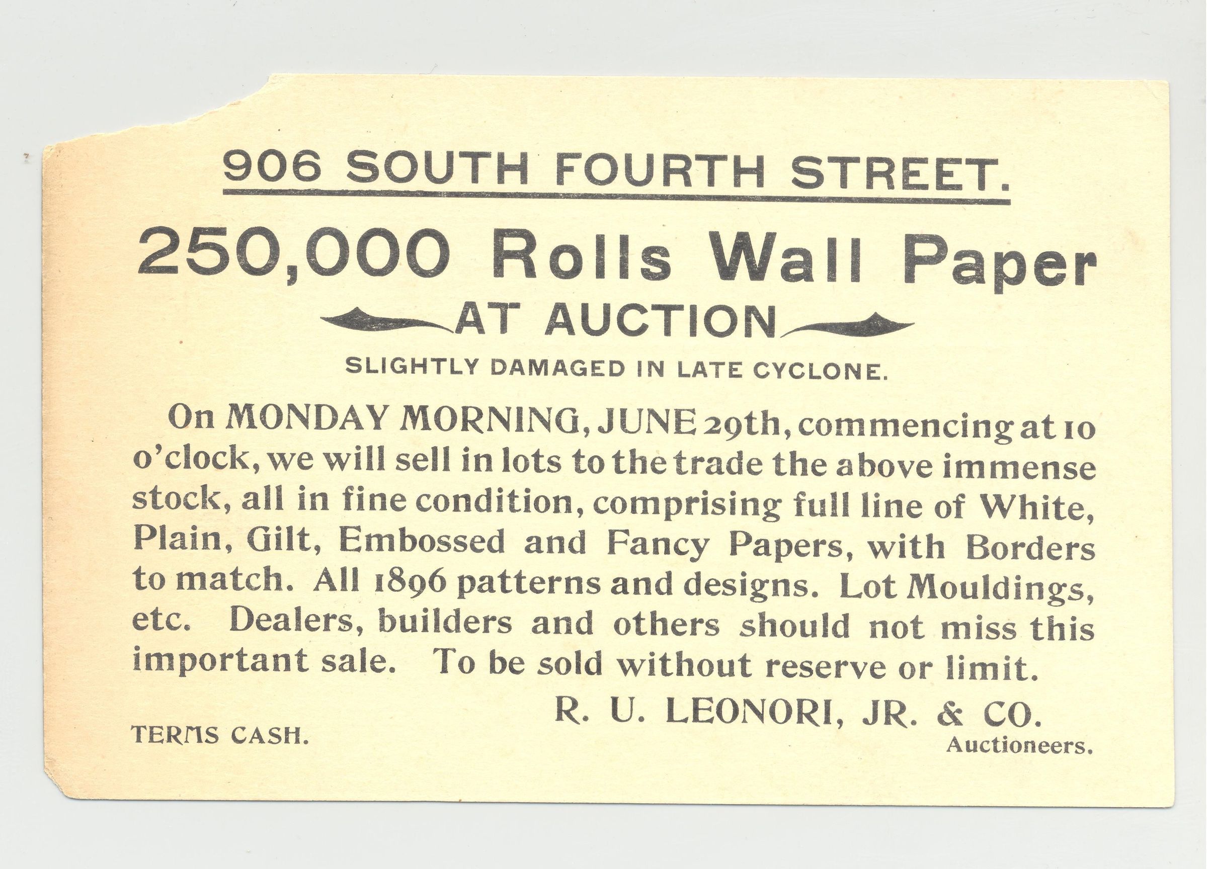 PSTCD, 1896 PATTERNED WALLPAPERS, "SLIGHTLY DAMAGED IN LATE CYCLONE" R.U. LEONORI, JR.