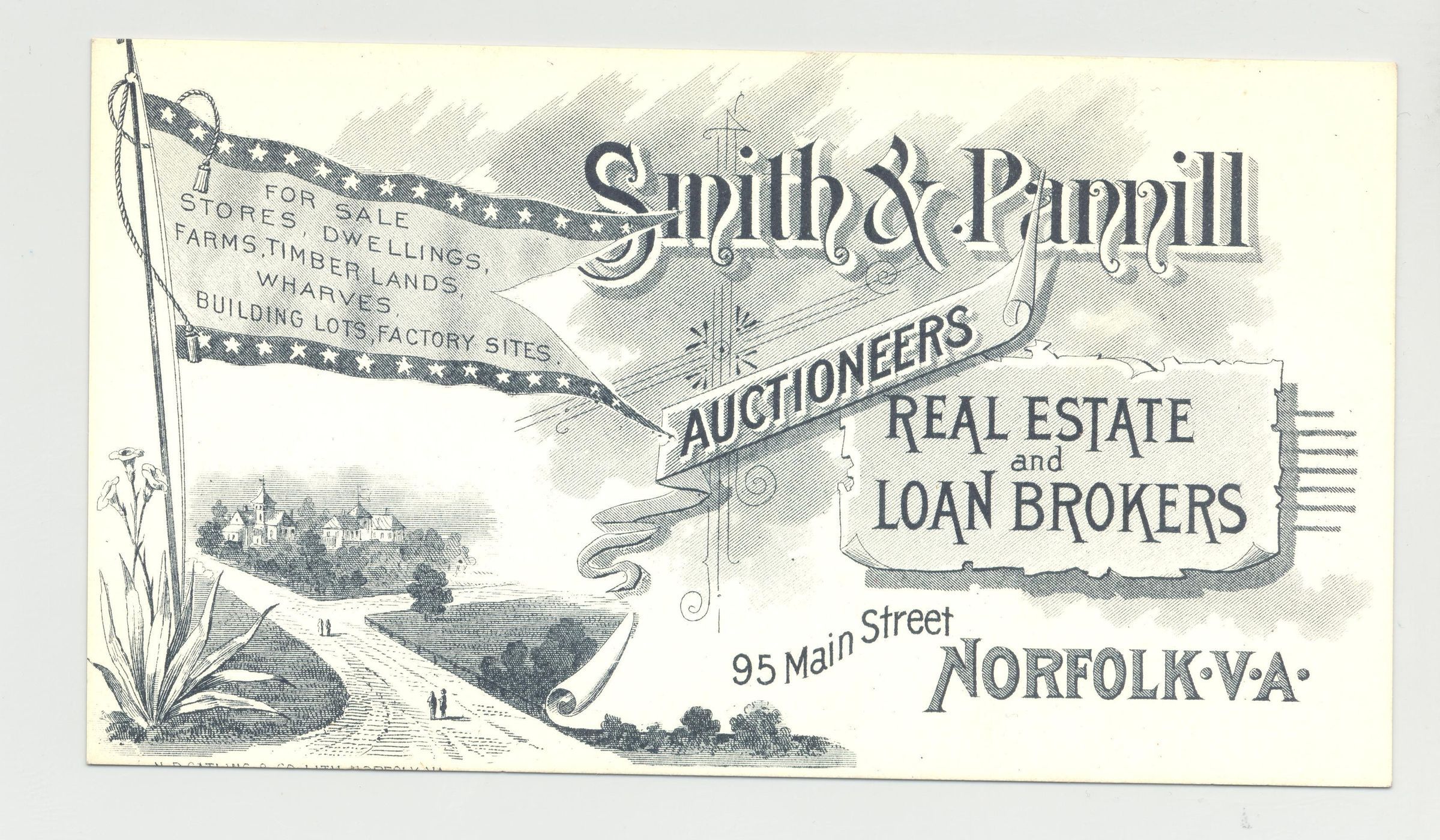 PSTCD, VA. SMITH & PANNILL, AUCTIONEERS, REAL ESTATE AND LOAN BROKERS, NORFOLK. PRINT B/W FLAG W/STARS LIKE CONFEDERATE, SCROLL TYPE ARTWORKCreated By