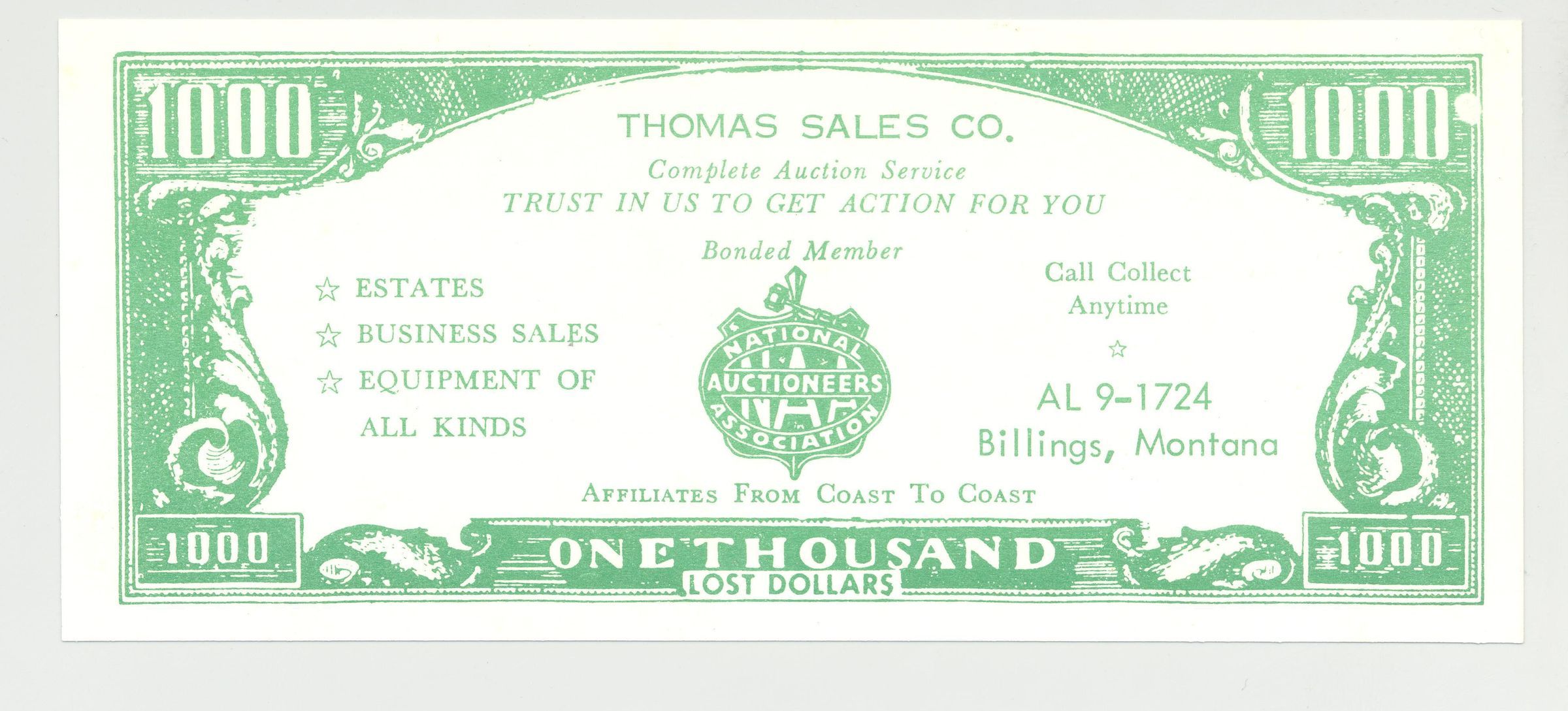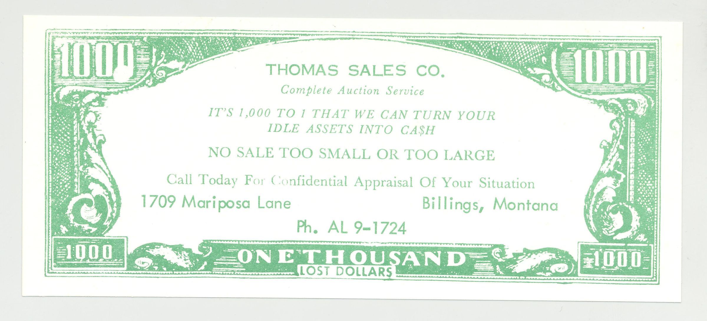 ADV, IMIT. PAPER MONEY, MT. NAA LOGO, BONDED MEMBER. THOMAS SALES CO. "IT'S 1000 TO 1 WE CAN TURN YOUR IDLE ASSETS INTO CASH. TRUST IN US TO GET ACTION FOR YOU"Created By