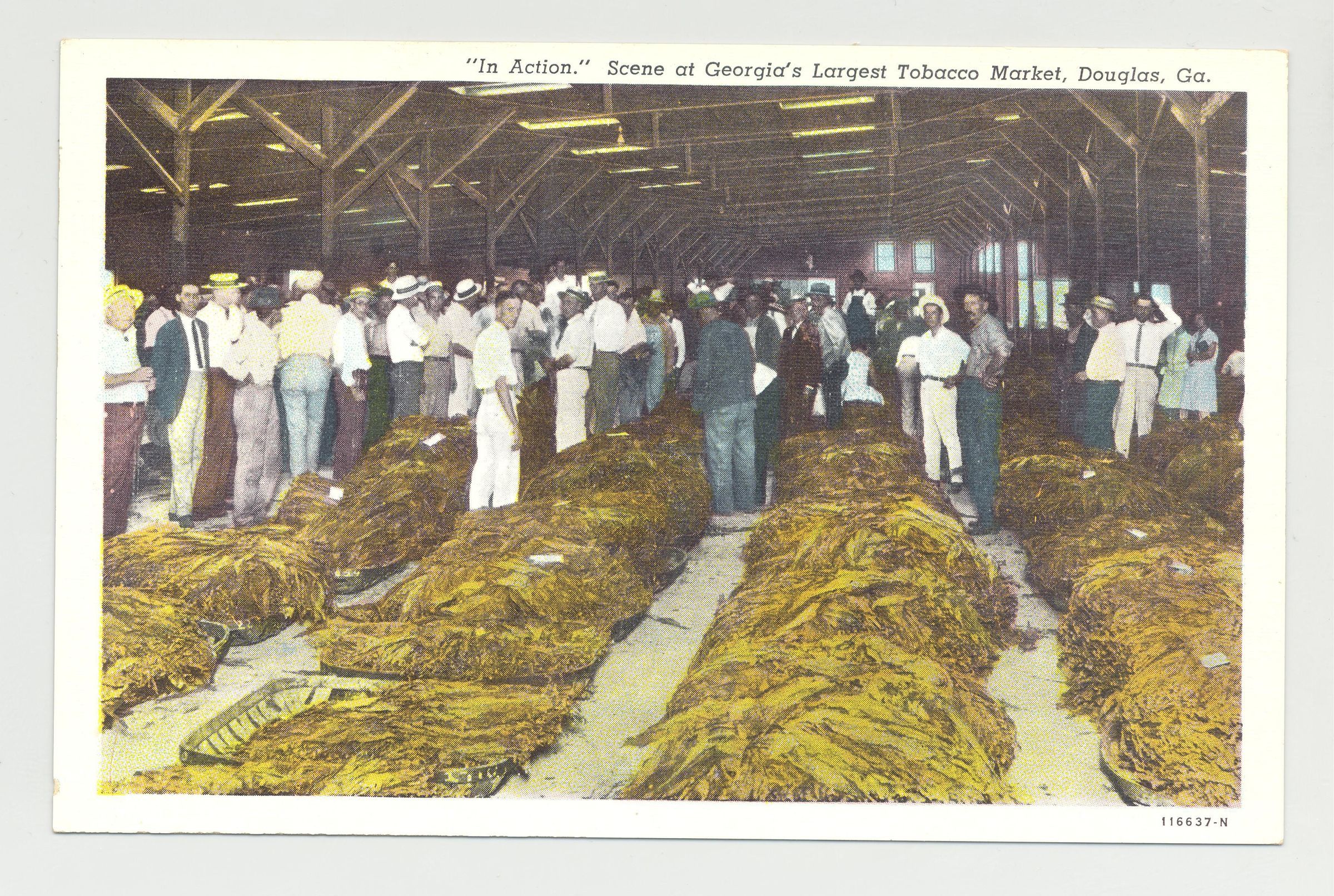 PSTCD, GA, TOBACCO. "IN ACTION" SCENE AT GEORGIA'S LARGEST TOBACCO MARKET, DOUGLAS, GA. PILES OF TOBACCO, WITH AISLES AND CROWDCreated By