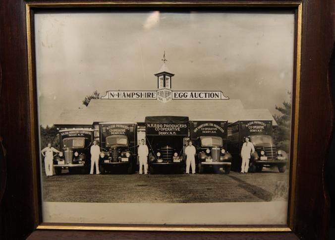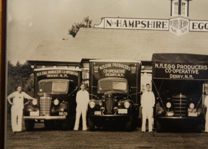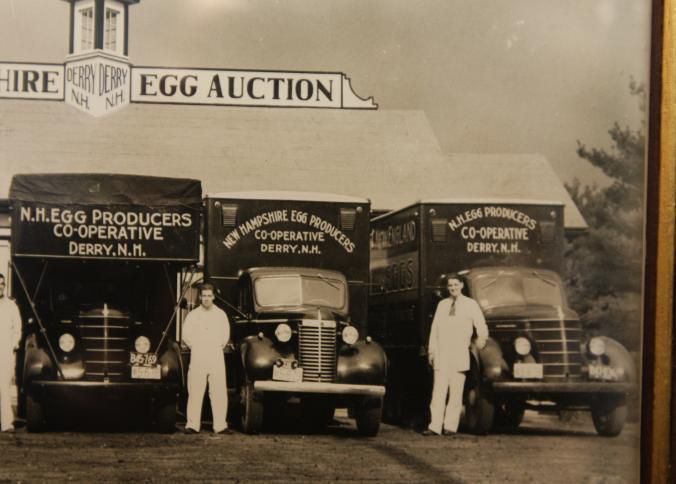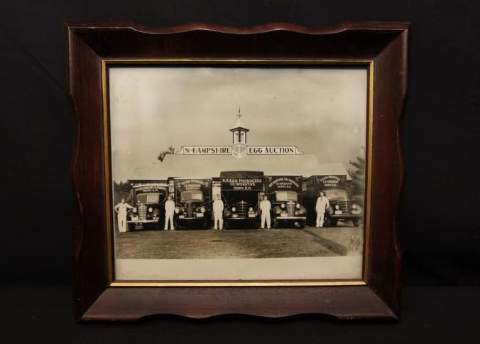 FR. EARLY 20THC NEW HAMPSHIRE EGG AUCTION PHOTO. 7 1/2X9". FABULOUS PHOTOGRAPH OF FIVE TRUCKS WITH DRIVERS IN WHITE UNIFORMS ADVERTISING "N.H. EGG PRODUCERS CO-OPERATIVE DERRY, N.H." NO DATE.Created By