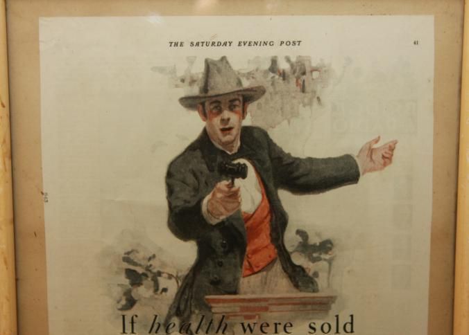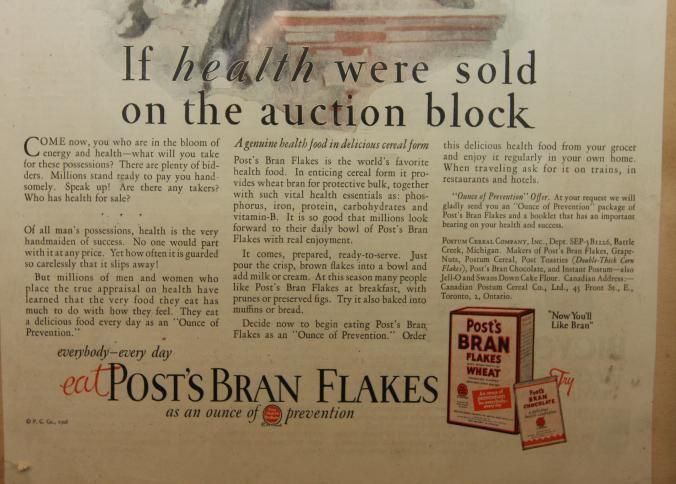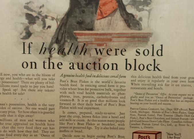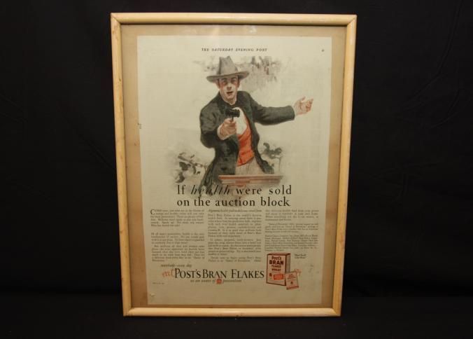 FR. 1926 "IF HEALTH WERE SOLD ON THE AUCTION BLOCK" POST BRAN FLAKES MAG. ADV. 10X14". FANTASTIC FULL PAGE ADV. FROM SATURDAY EVENING POST DEPICTING WELL DRESSED AUCTIONEER WITH AUCTION HAMMER AT PODIUM WEARING COWBOY HAT STATING "COME NOW, YOU WHO ARE IN THE BLOOM OF ENERGY AND HEALTH - WHAT WILL YOU TAKE FOR THESE POSSESSIONS? THERE ARE PLENTY OF BIDDERS. MILLIONS STAND READY TO PAY YOU HANDSOMELY. SPEAK UP! ARE THERE ANY TAKERS? WHO HAS HEALTH FOR SALE?" AUCTION MARKETING IN A POSITIVE LIGHT.Created By