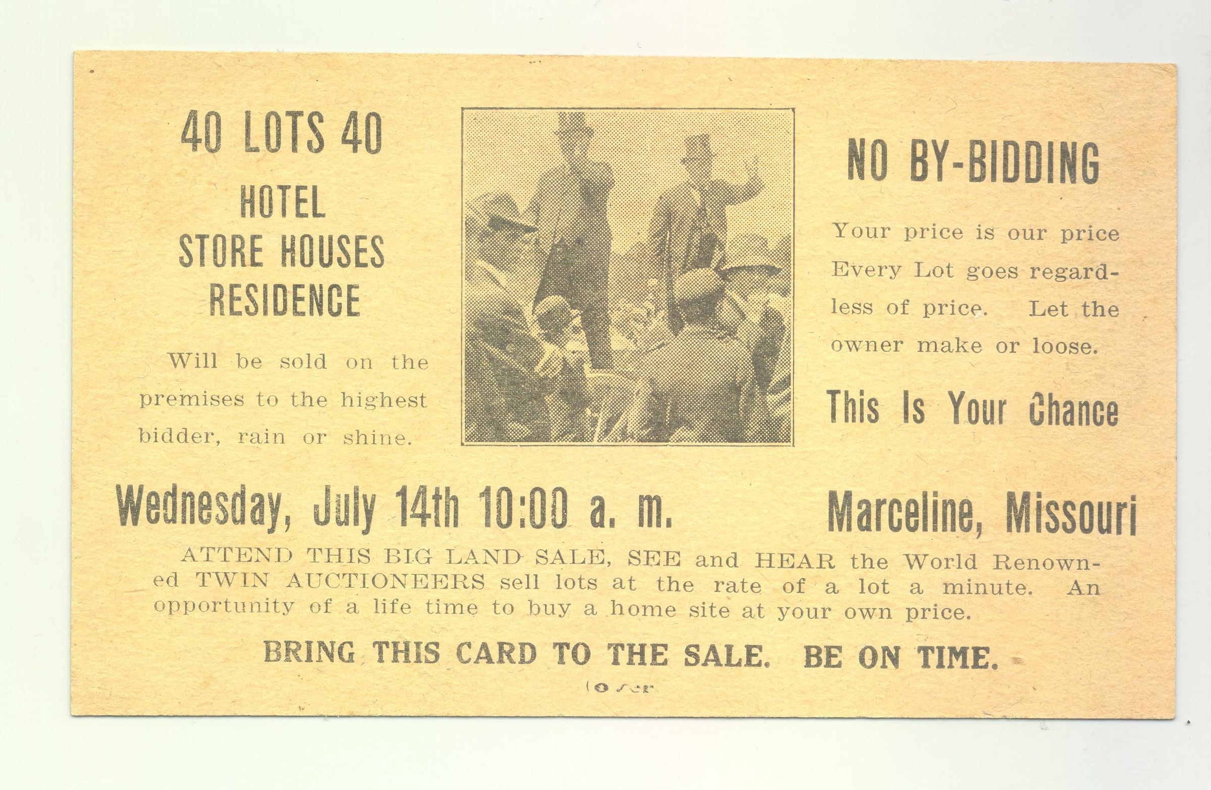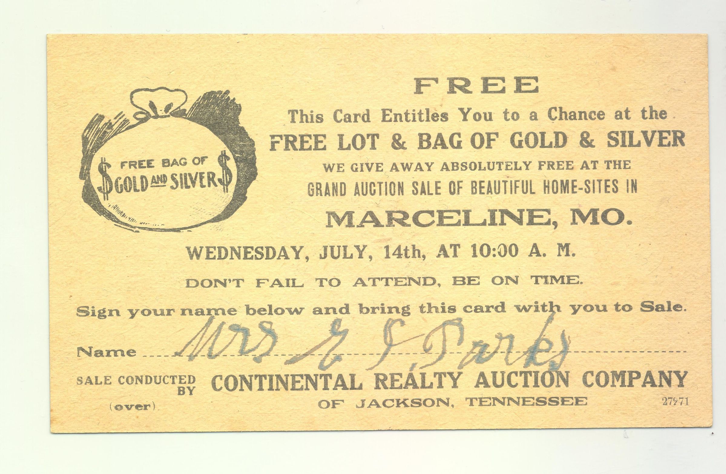 ADV CARD, LAND, MO. LOTTERY ON BACK. CONTINENTAL REALTY AUCTION CO. FREE LOT AND BAG OF GOLD AND SILVER PRIZE " SEE AND HEAR THE WORLD RENOWNED TWIN AUCTIONEERS"Created By