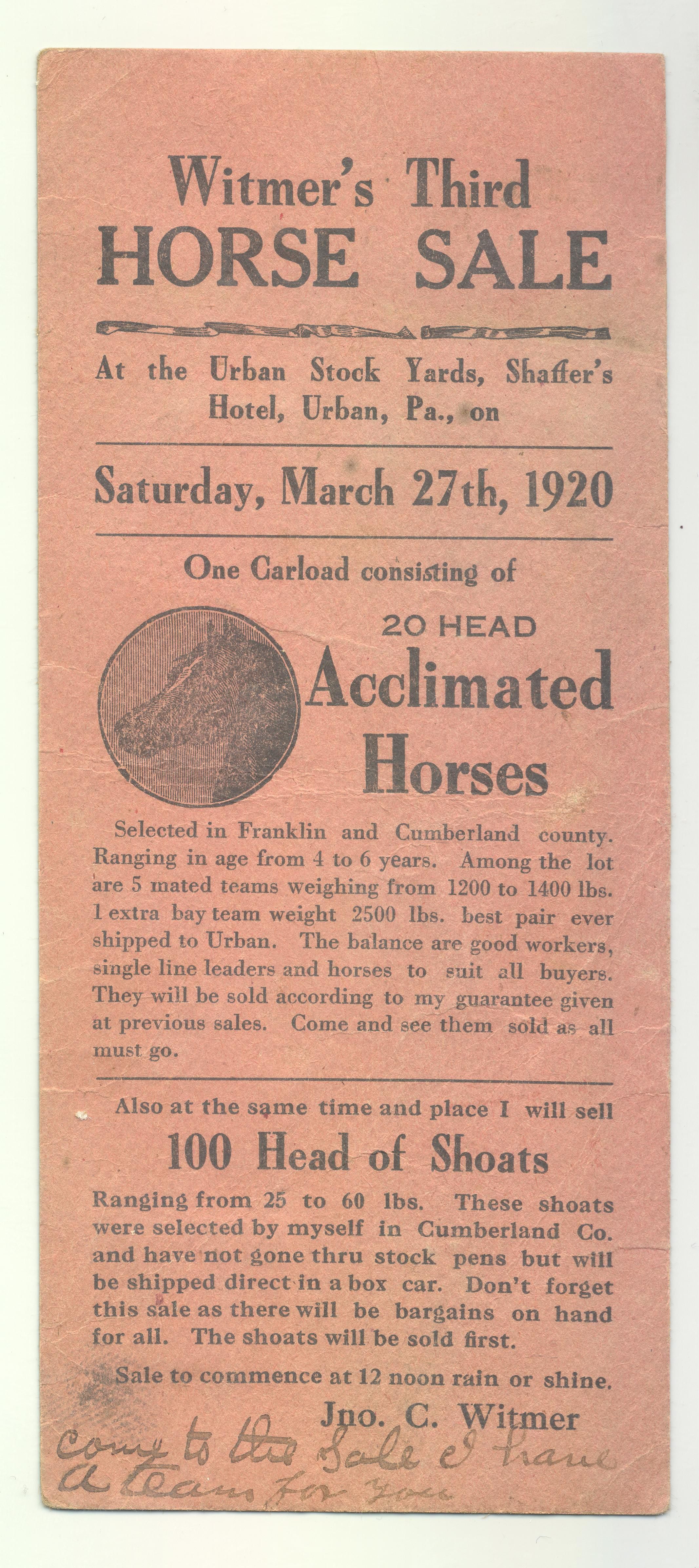 PSTCD, 1920, HORSE, PA. WITMER'S THIRD HORSE SALE, URBAN, PA. JNO. C. WITMER.