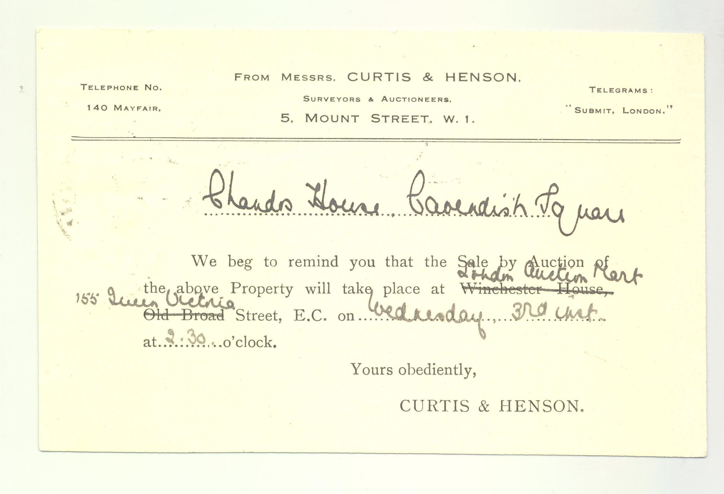 PSTCD, 1922, FOREIGN, LONDON, CURTIS & HENSON, SURVEYORS & AUCTIONEERS