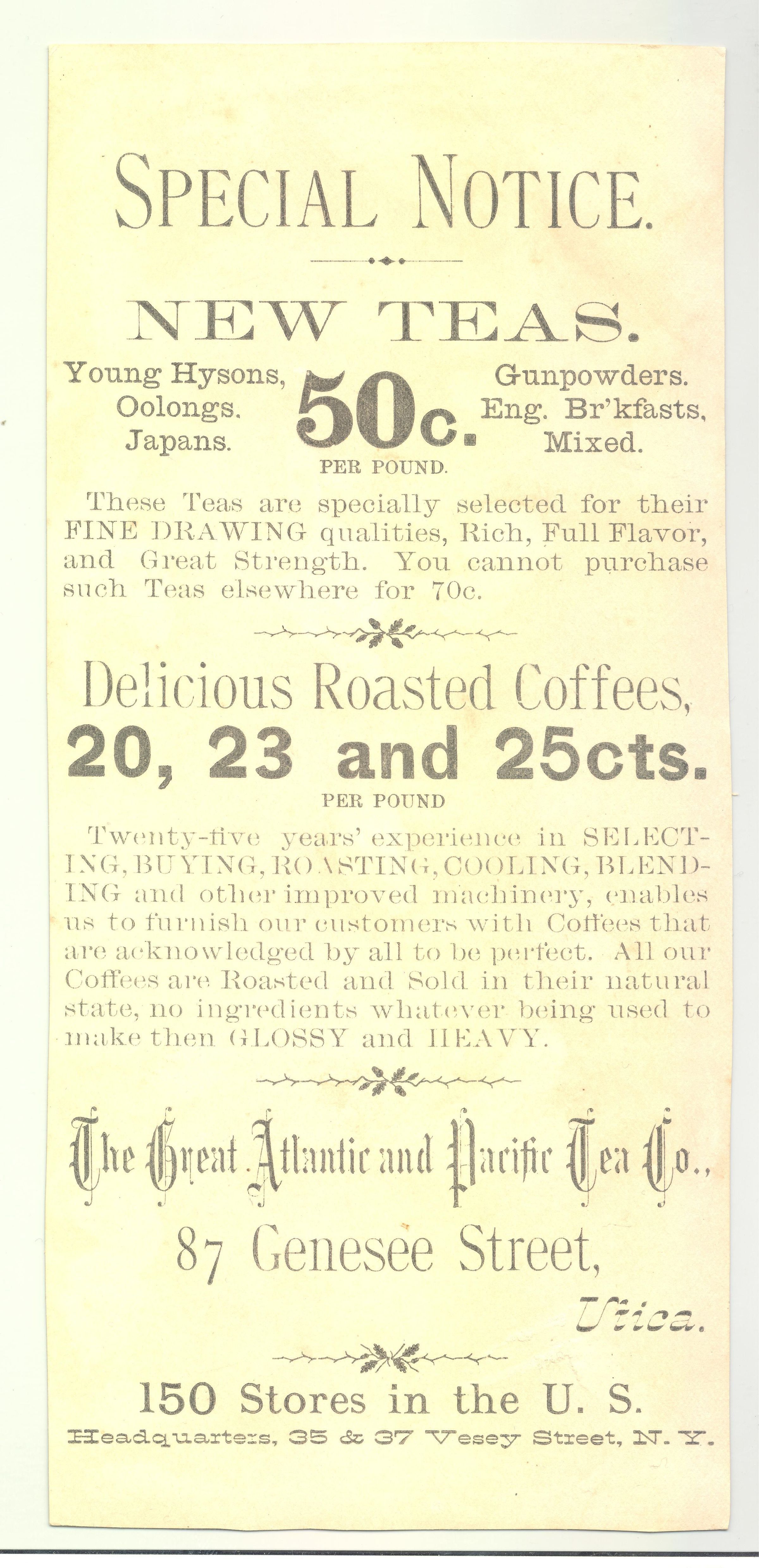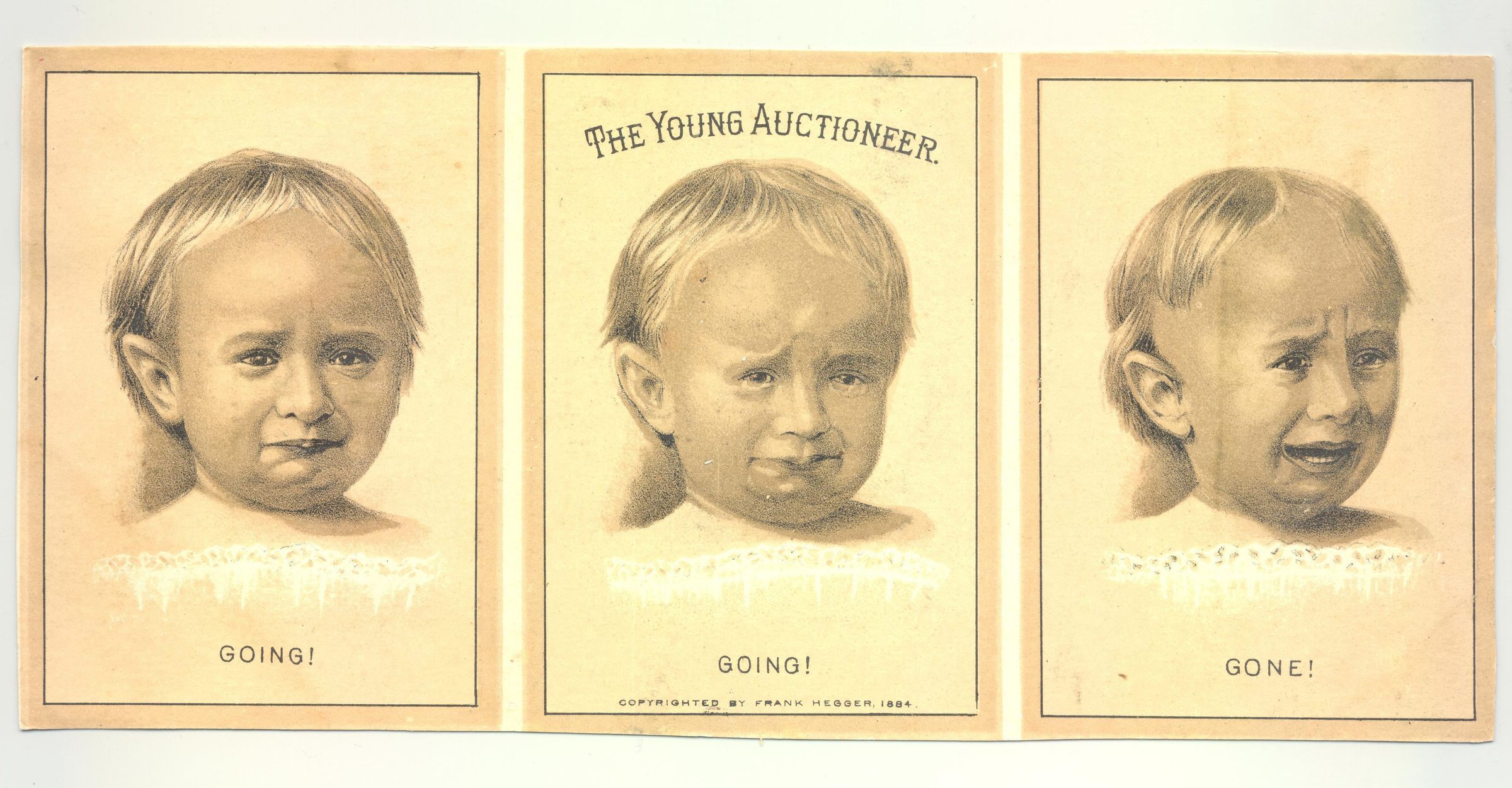 ADV CARD, TEA, NY. 1884 COPYRIGHT, THE YOUNG AUCTIONEER, "GOING GOING GONE!" BABY POUT AND CRY. 8 1/4" X 4"Created By