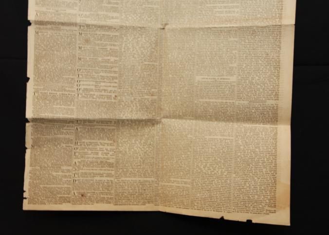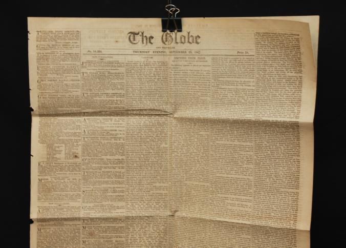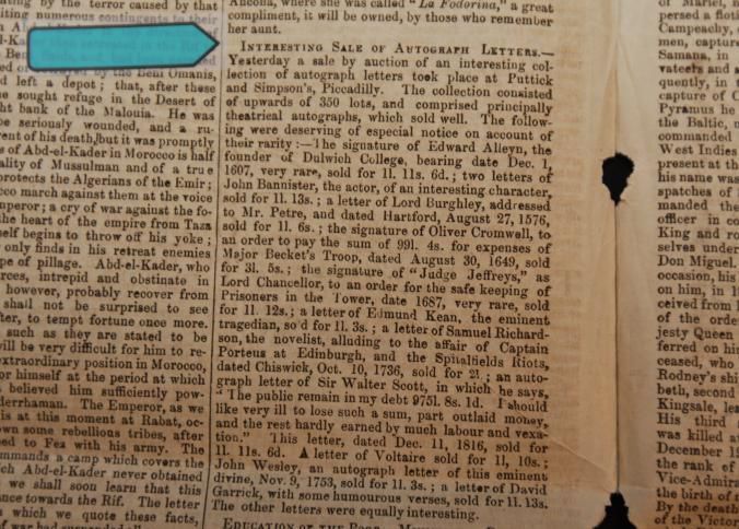 NEWSPAPER, 1847, AUTOGRAPHED LETTERS. PUTTICK AND SIMPSON'S, PICCADILLY. VOLTAIRE, SIR WALTER SCOTT, OLIVER CROMWELL & OTHERS MENTIONED, PRICES NOTED. 24" X 17 3/4" FOLDED PAPERCreated By