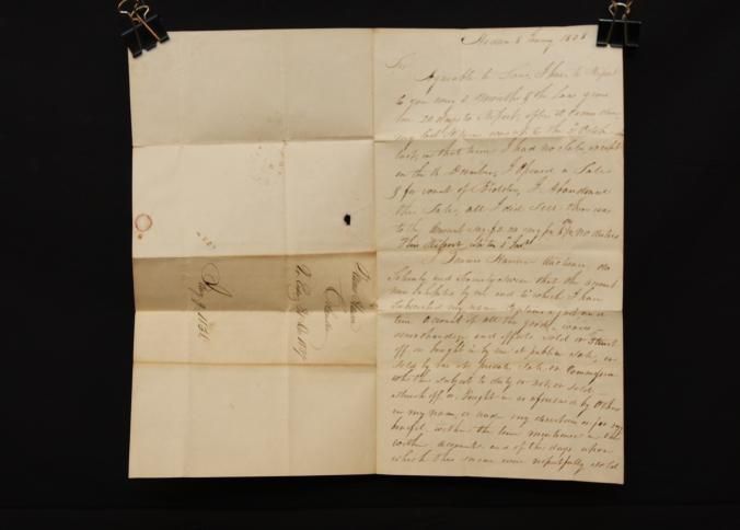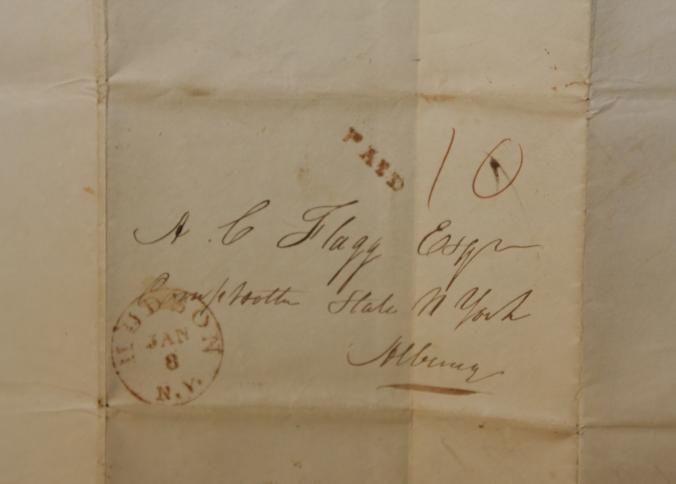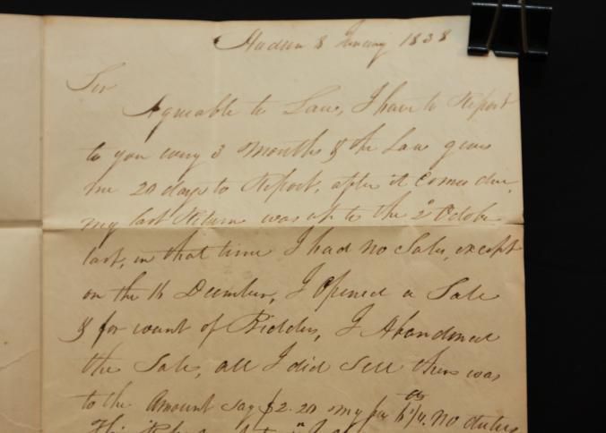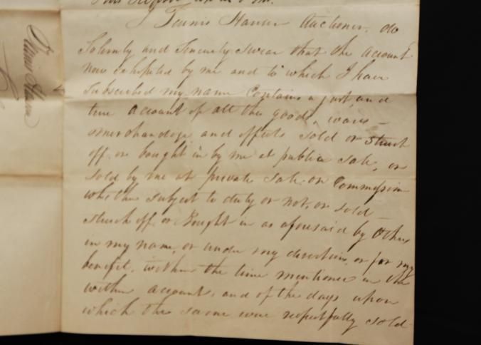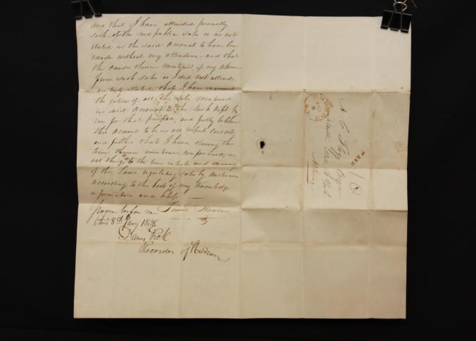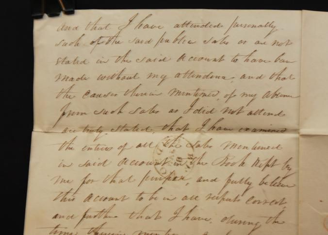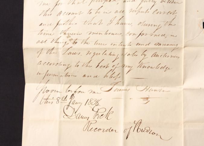 DOC, LETTER, 1838, NY. JAMIS HANSEN AUCTIONEER, SETTLEMENT STATEMENT, 13" X 7 3/4" FOLDED PAPER