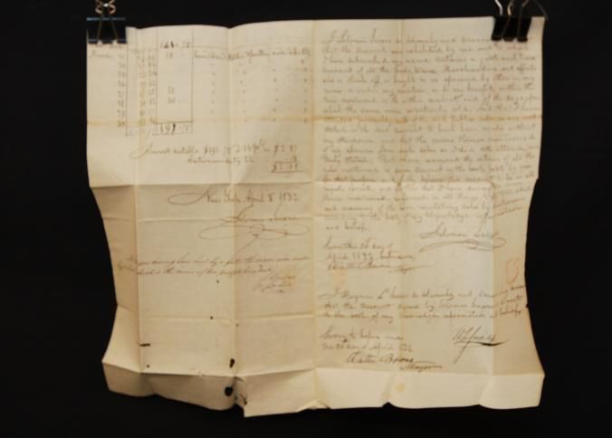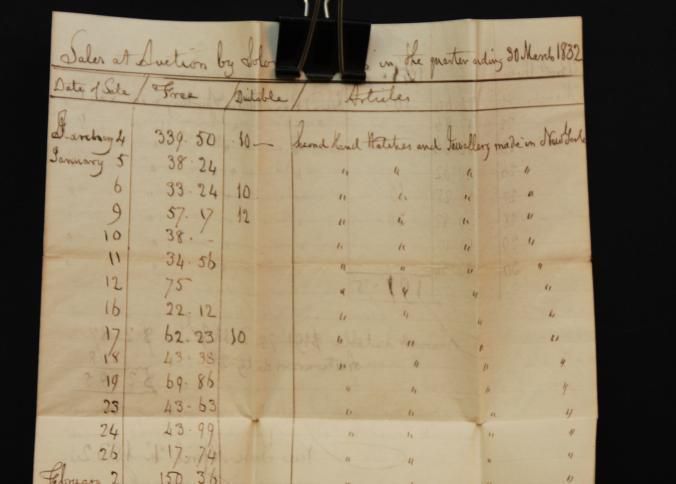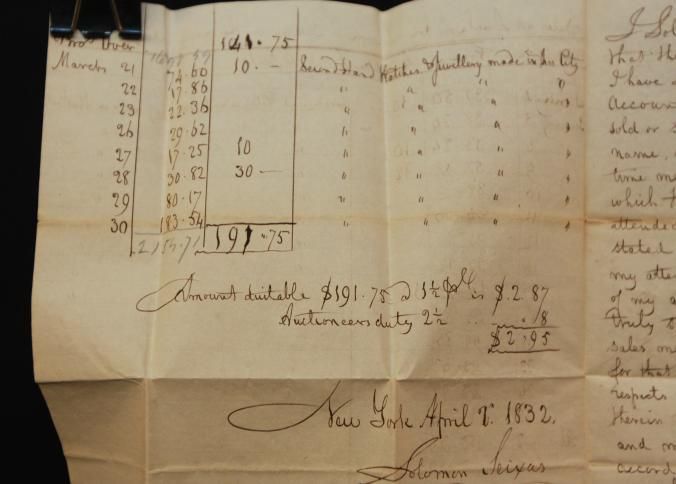 DOC, 1832, AUCTION SETTLEMENT, ALBANY, NY. SOLOMON SEIXAS AUCTIONEER 8" X 12 1/2"