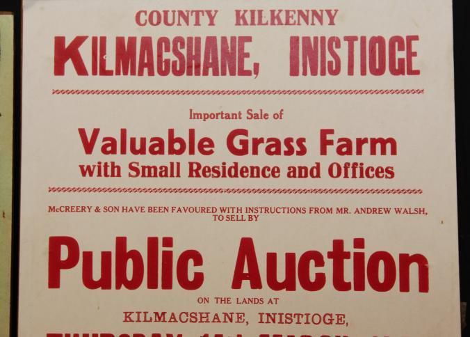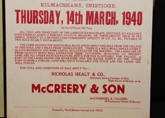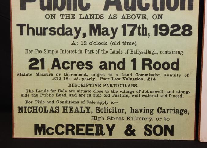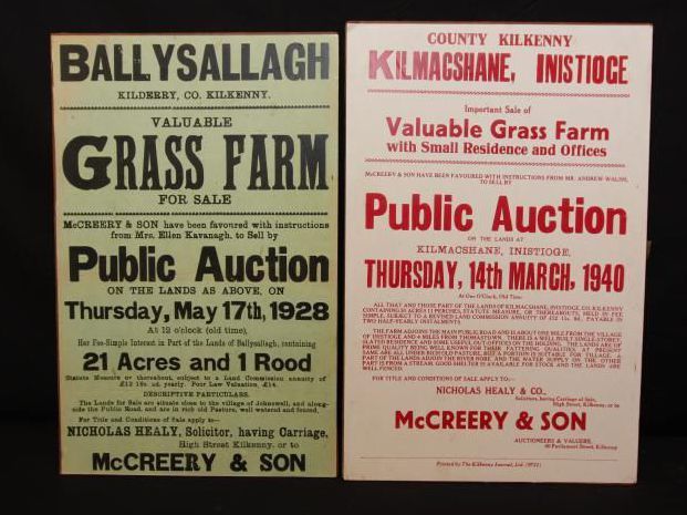 PAIR OF MC CREERY & SONS IRISH MOUNTED BROADSIDES. 11X16". A. 1928 "BALLYSALLAGH" VALUABLE GRASS FARM FOR SALE." B. 1940 REAL ESTATE AND VALUABLE GRASS FARM. BOTH POSTERS ARE FOR AUCTIONS IN KILKENNY, IRELAND.Created By