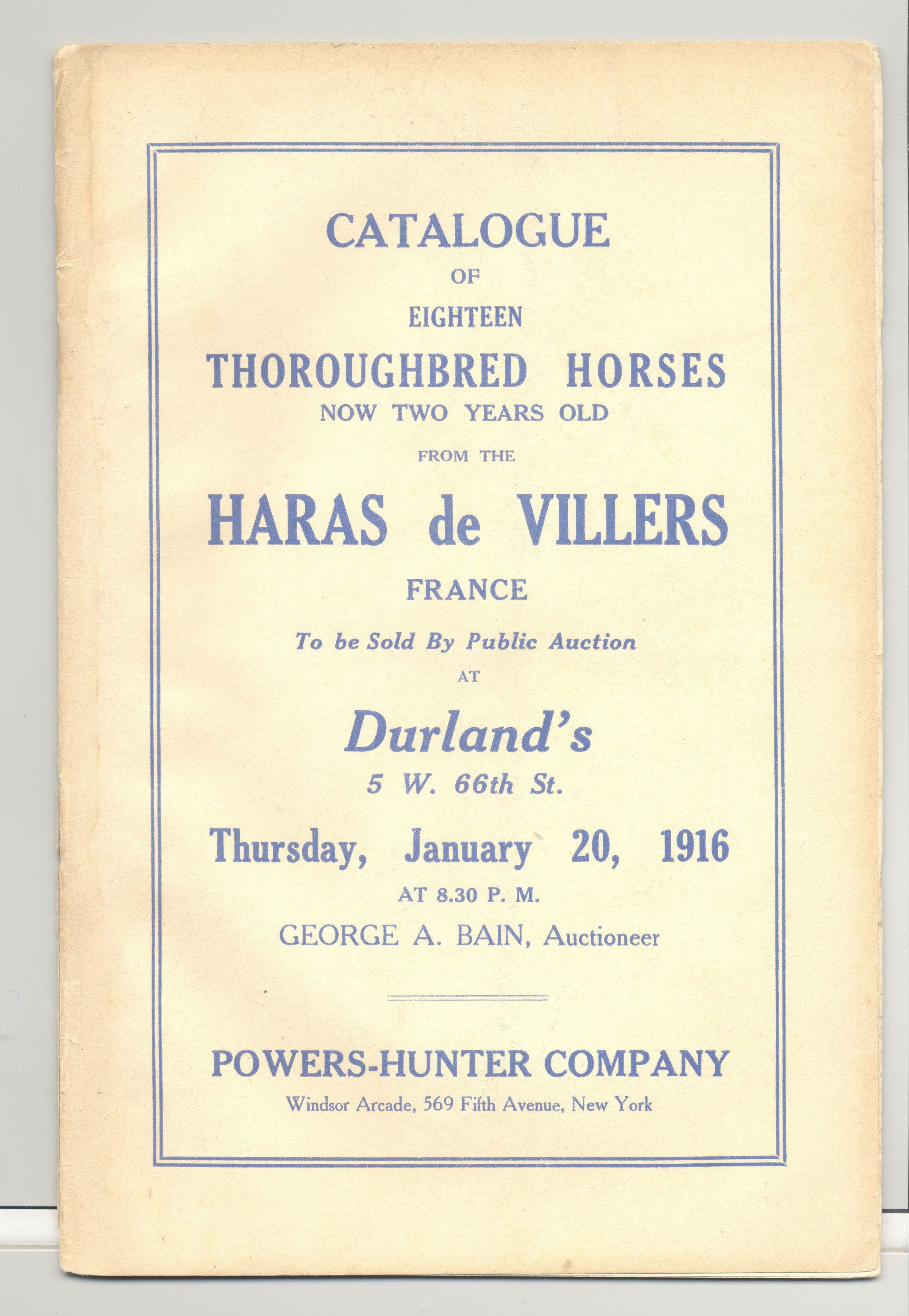CAT, HORSE, 1916, NY. 18 THOROUGHBRED HORSES FROM FRANCE. GEORGE BAIN, AUCT. PRICES IN PENCIL. 14 PP. 6" X 9"Created By