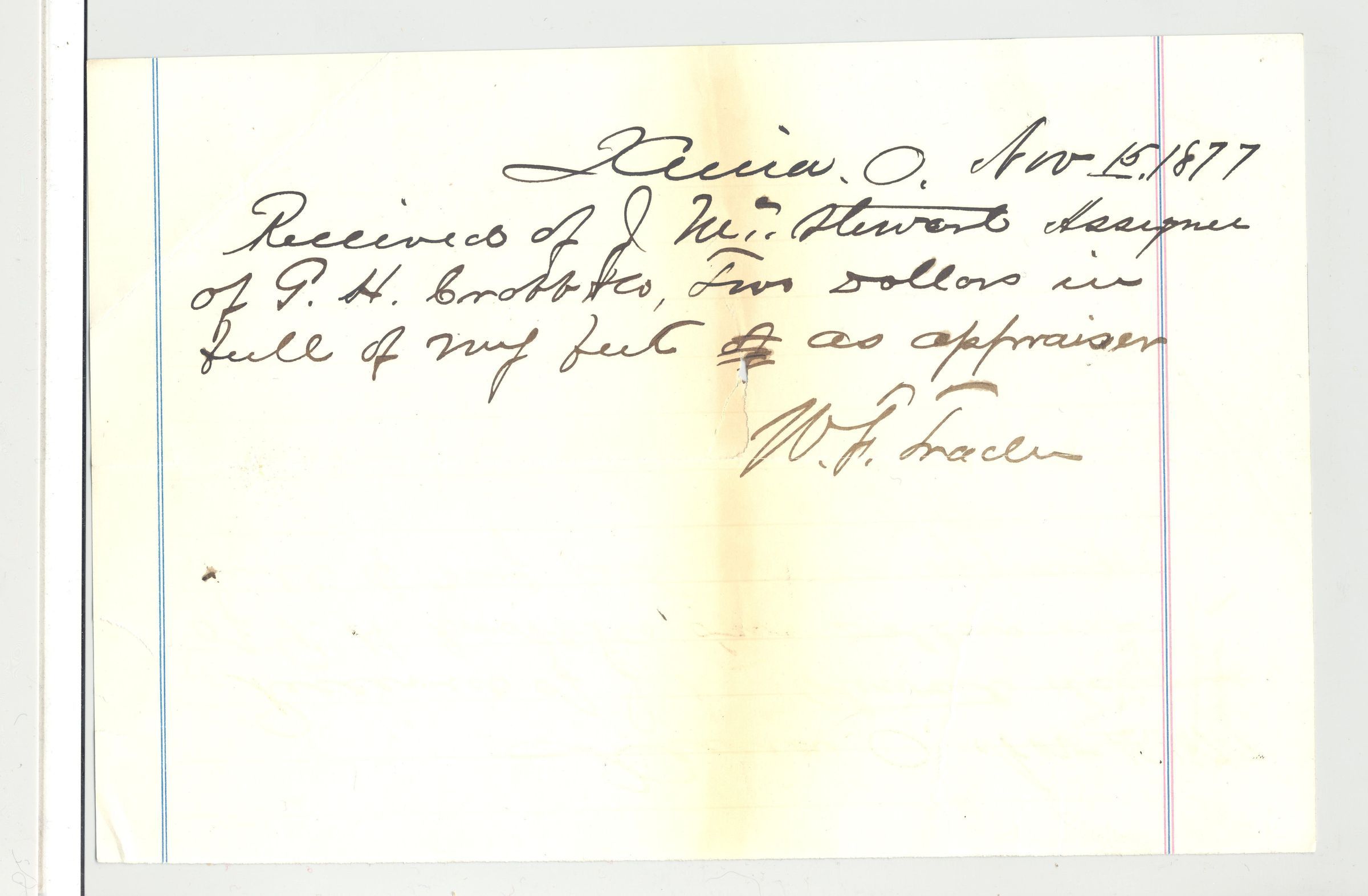 REC, 1877, TWO DOLLARS PD TO W.F. TRACEY(?) APPRAISER.