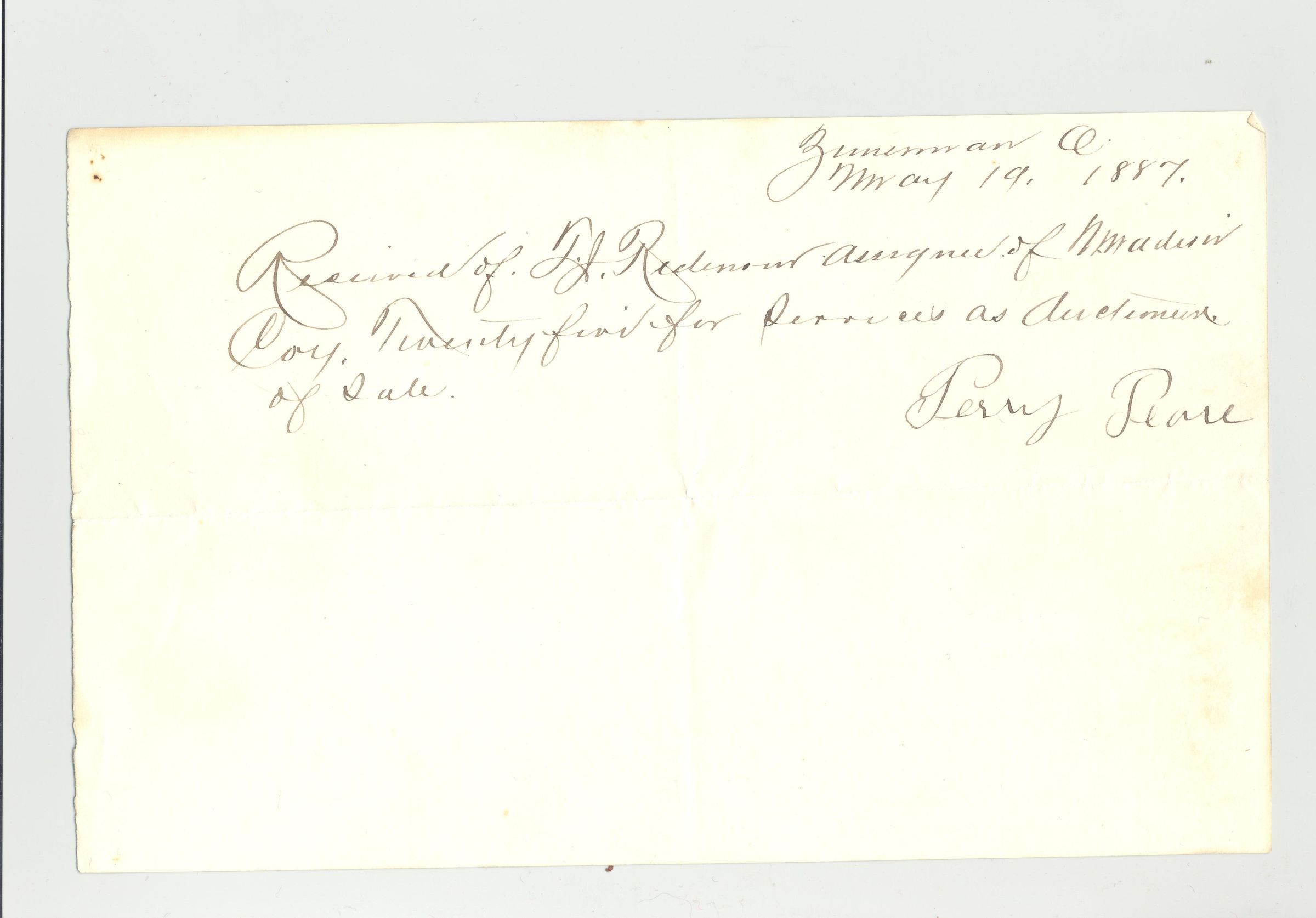REC, 1887, $25 FOR SERVICES AS AUCTIONEER. PERRY PEARE