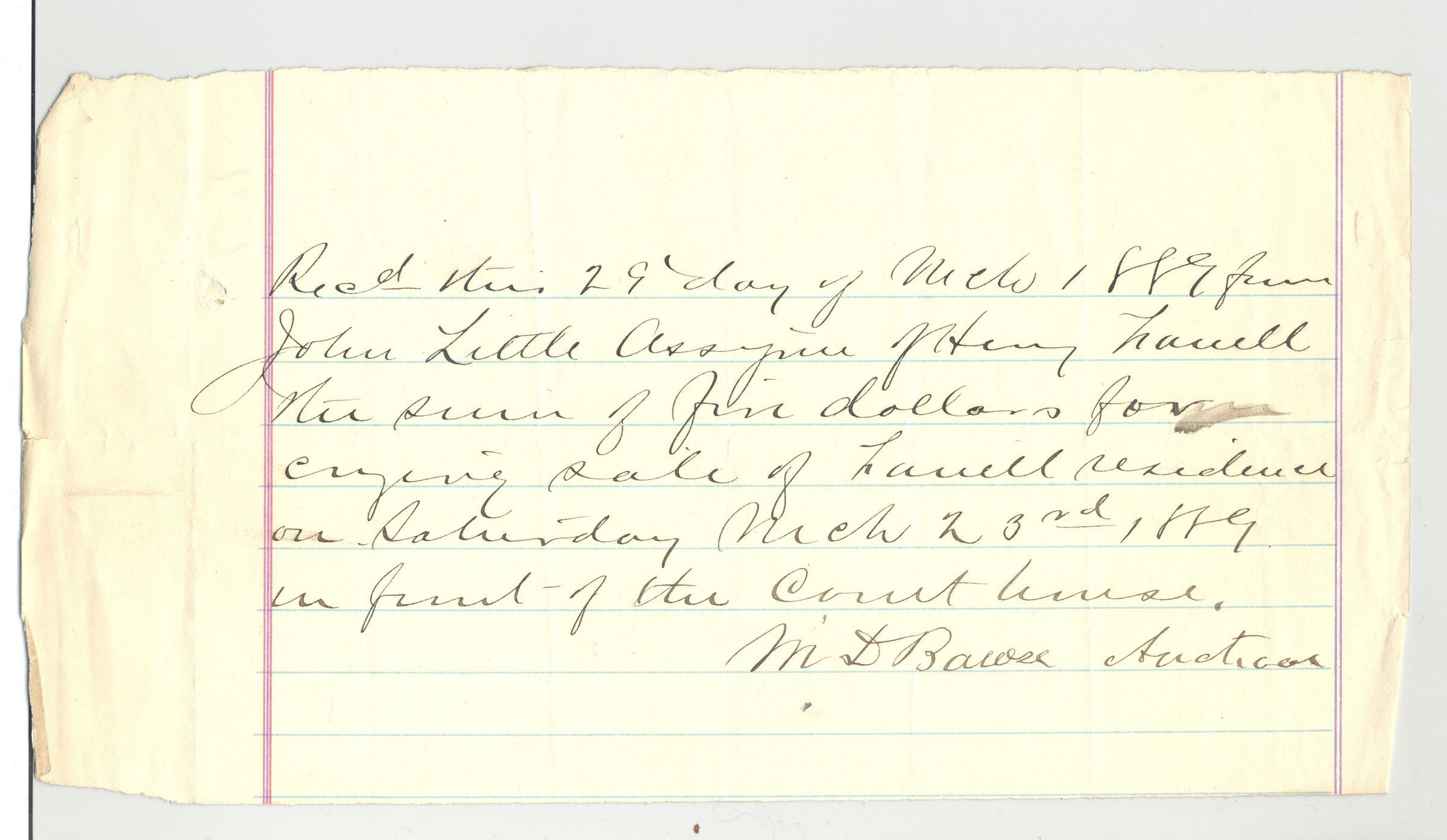 REC, 1889, $5 FOR CRYING SALE OF FARRELL RESIDENCE ... M.D. BAWSE, AUCTIONEER.
