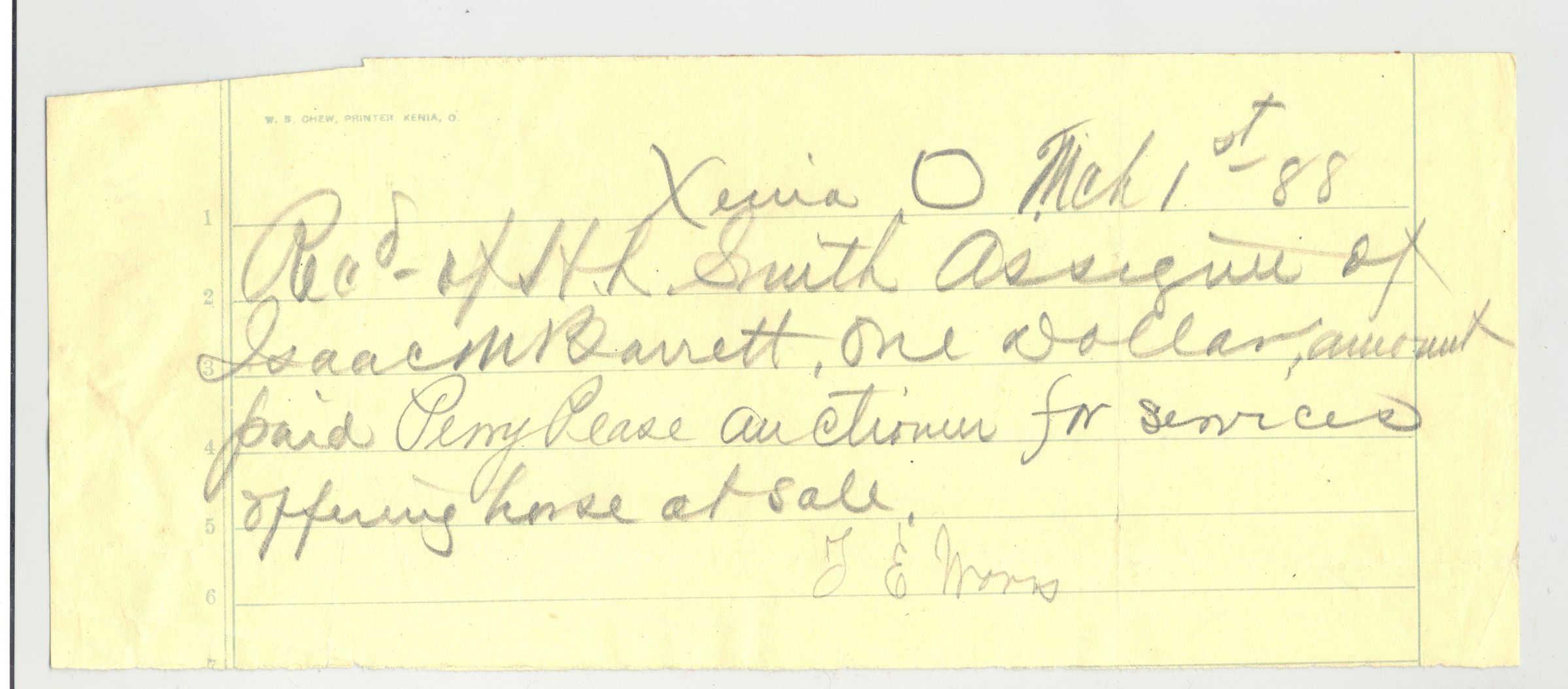 REC, 1888, PAYMENT OF ONE DOLLAR TO PERRY PEASE, AUCTIONEER