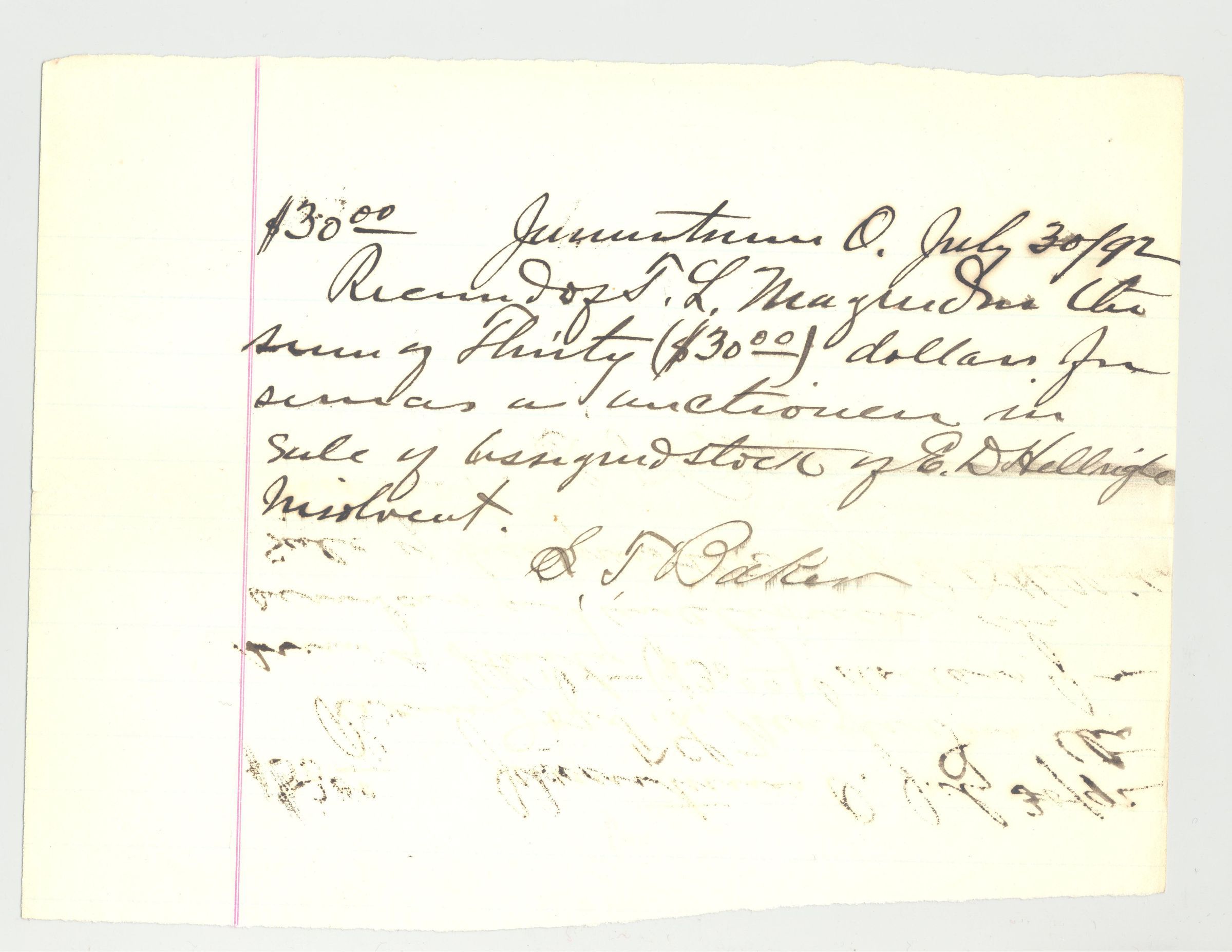 REC, 1892, $30 FOR SERVICES AS AUCTIONEER. SIGNED BAKER.