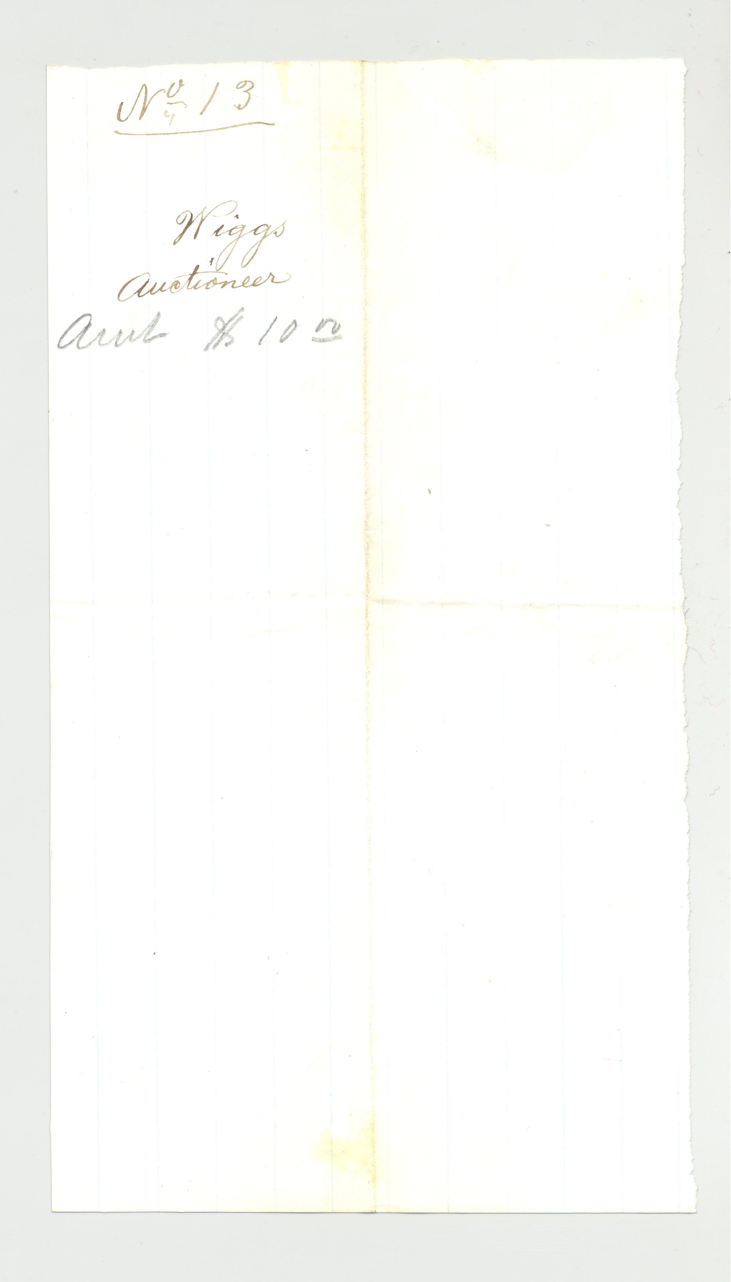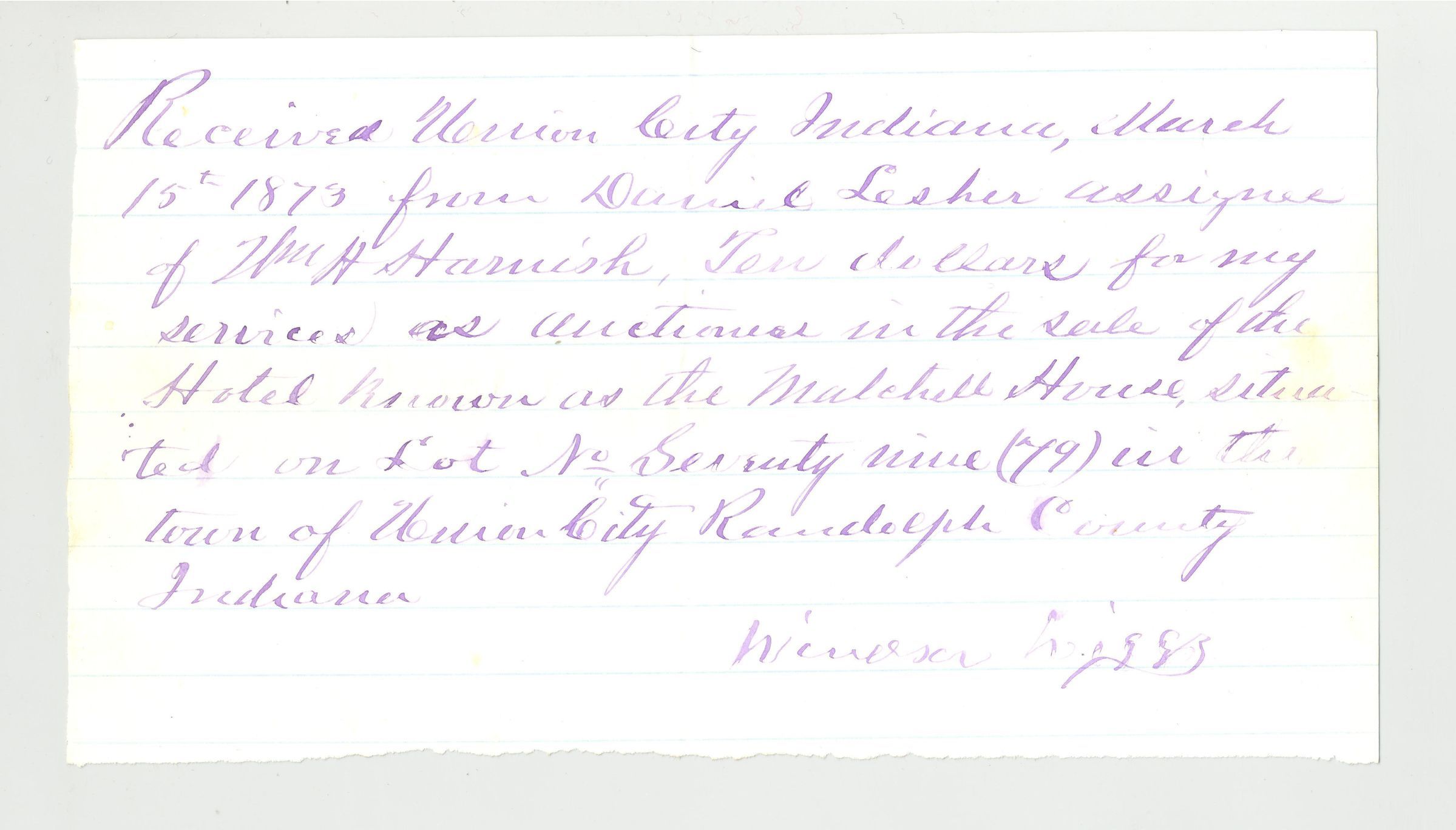 REC, 1873, IN. $10 FOR SERVICES AS AUCTIONEER. SIGNED WIGGS
