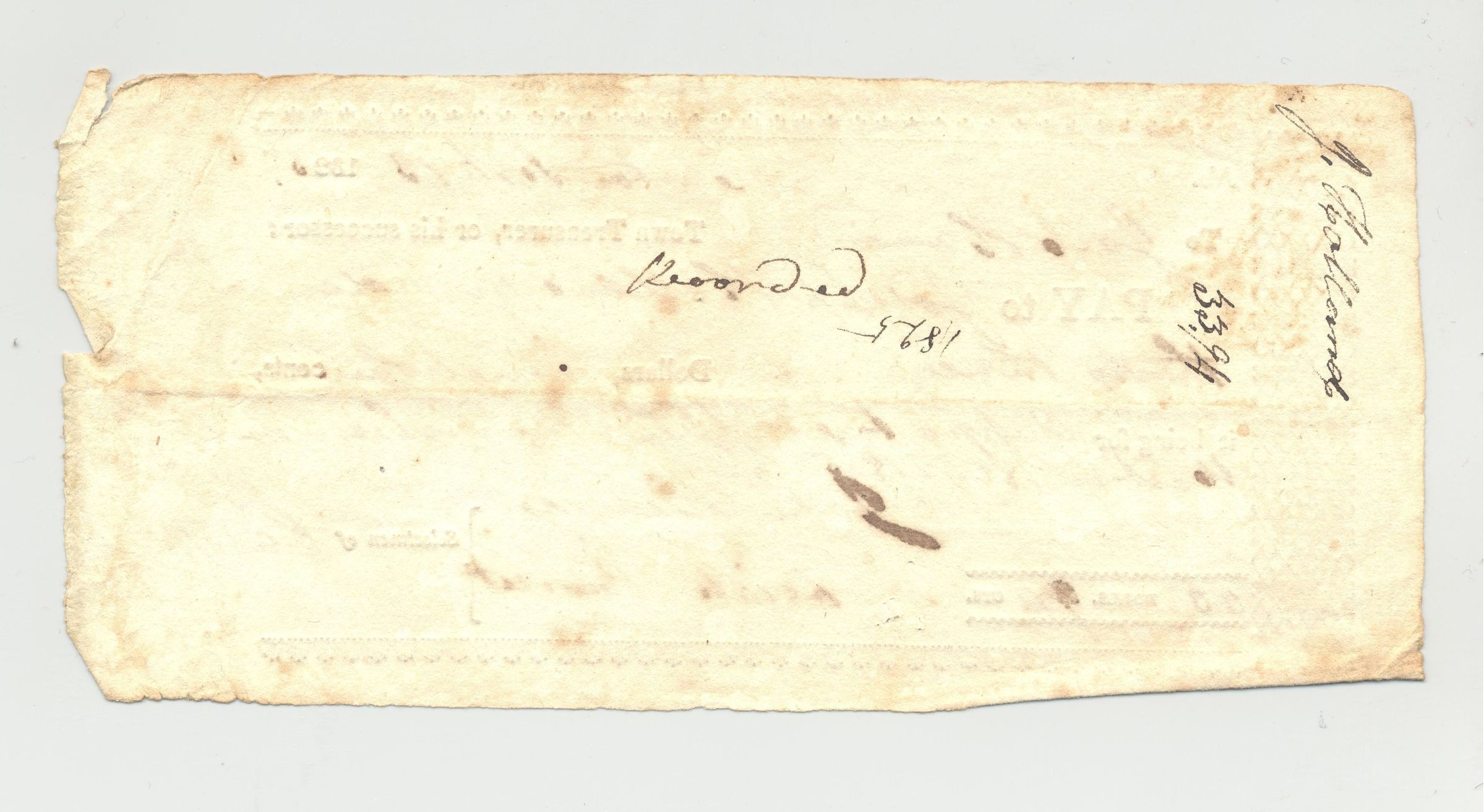 DOC, 1825. NOTE ISSUED BY CANTON SELECTMEN JOHN HEARSEY AND JOSIAH BENNET, AUTHORIZES PYMT TO JOSEPH HOLLAND 'FOR SUPPORT AND SUPPLIES FURNISHED MRS. LUCY WEST IN 1824 & 1825" RELATES TO PRACTICE OF AUCTIONING OFF TOWN PAUPERS TO LOWEST BIDDER. BIDDER PROVIDES MEALS, LODGING, OTHER SUPPLIES FOR THIS AMT.Created By