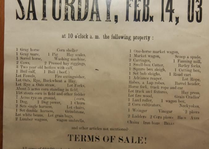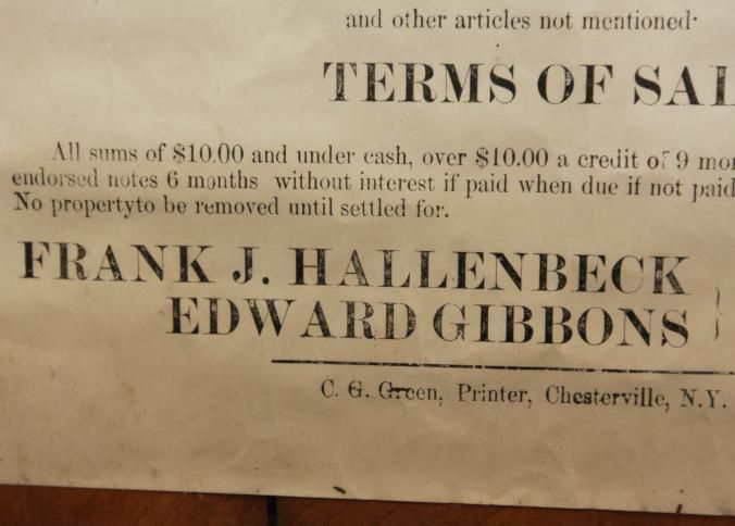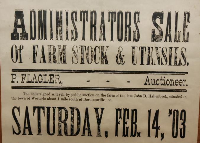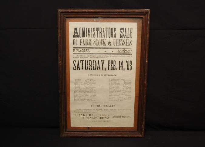 FR. 1903 NY "FARM STOCK & UTENSILS" AUCTION BROADSIDE. 12X17". AUCTIONEER P. FLAGLER WAS SELLING FOR THE ADMINISTRATORS OF JOHN D. HALLENBECK'S ESTATE ON THE FARM OF THE LATE JOHN D. HALLENBECK, SITUATED IN THE TOWN OF WESTERLO ABOUT 1 MILE SOUTH OF DORMANSVILLE, ON SATURDAY, FEB. 14, 03 AT 10 O'CLOCK AM. THE BROADSIDE PROVIDES AN EXTENSIVE LIST OF LIVESTOCK, EQUIPMENT WAGONS AND CARRIAGES, PRODUCE AND "OTHER ARTICLE NOT MENTIONED.Created By