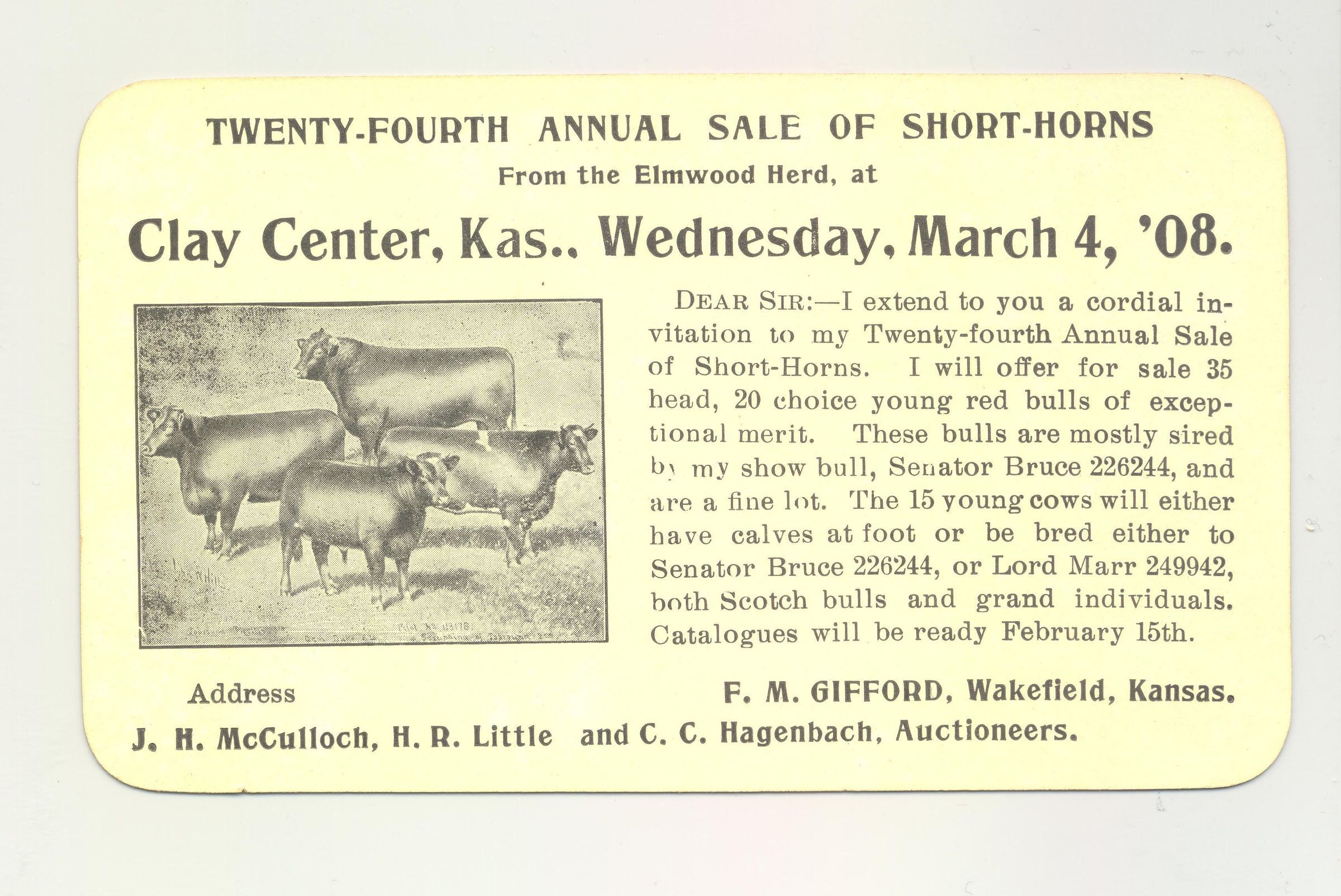 PSTCD, 1908, CATTLE, KS. 24TH ANNUAL SALE OF SHORTHORNS. J.H. MCCULLOCH, H.R. LITTLE & C.C. HAGENBACH, AUCTS.Created By