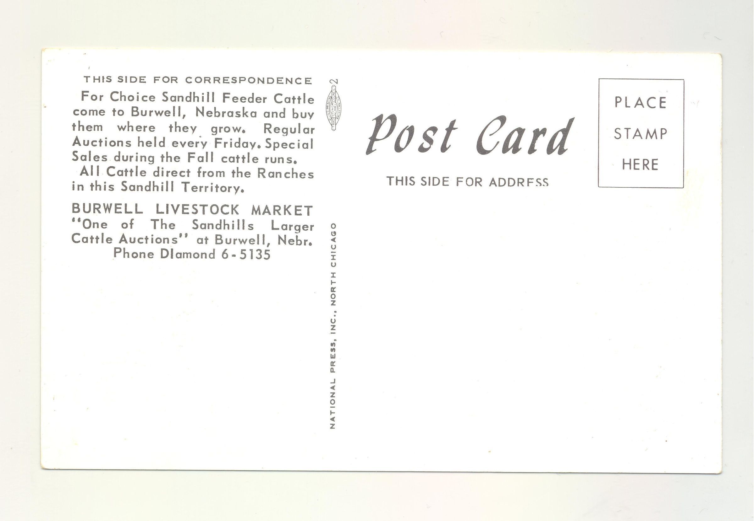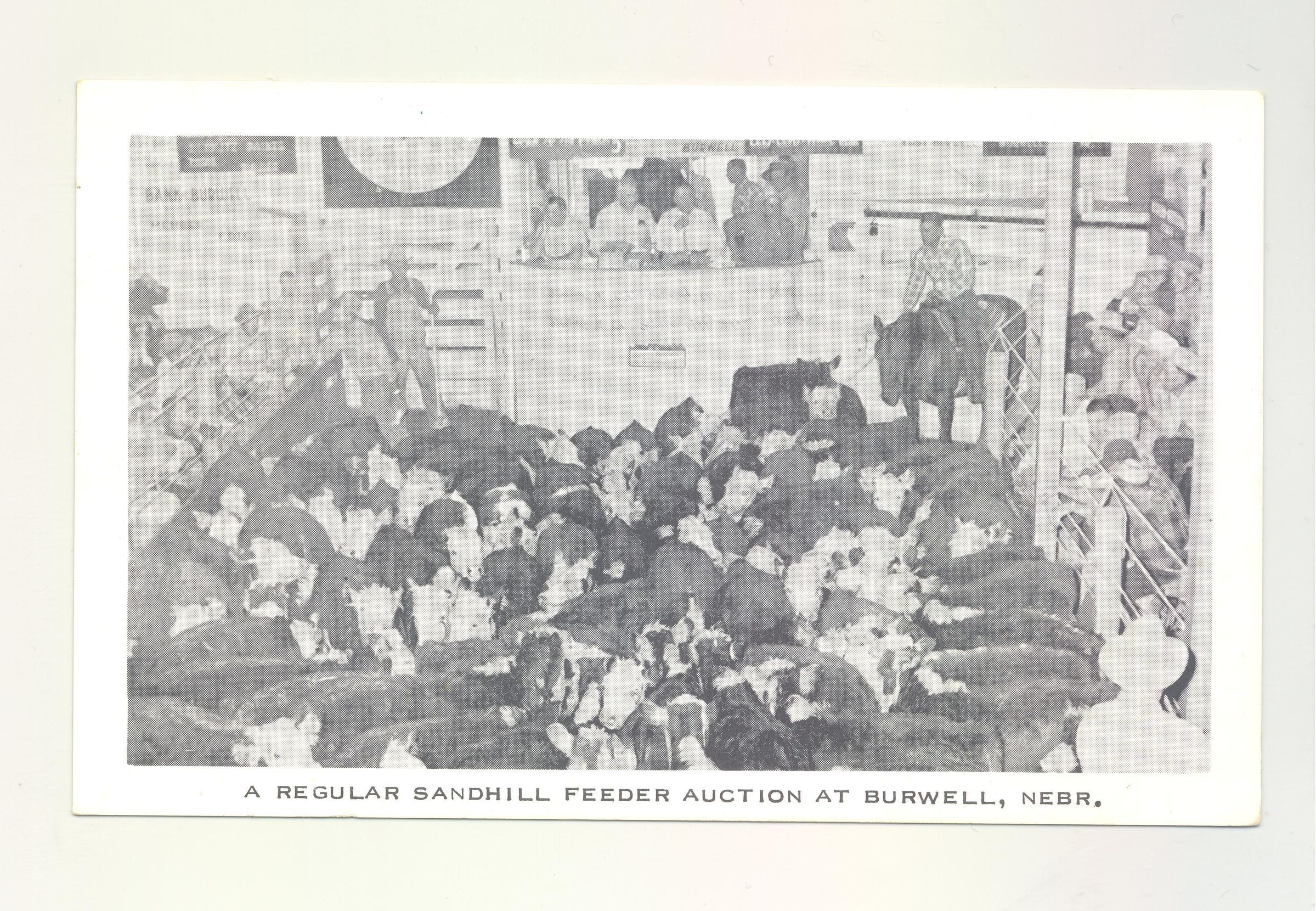 PSTCD, CATTLE, BURWELL, NE. "A REGULAR SANDHILL FEEDER AUCTION" PHOTO OF HERDED CATTLE, INDOOR AUCTION. NO DATECreated By