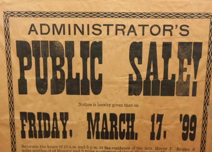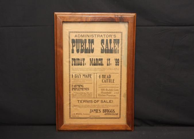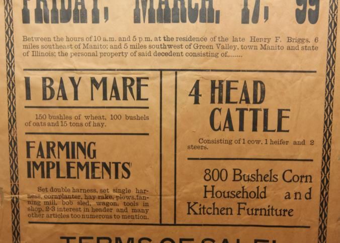 FR. 1899 ILL. ESTATE AUCTION BROADSIDE. 11 1/2X17". AUCTIONEER J.B. WHITE WAS SELLING FOR ADMINISTRATOR JAMES BRIGGS THE EFFECTS AND PERSONAL PROPERTY OF THE LATE HENRY F. BRIGGS. THE AUCTION WAS TO TAKE PLACE "6 MILES SOUTHEAST OF MANITO; AND 5 MILES SOUTHWEST OF GREEN VALLEY, TOWN OF MANITO AND STATE OF ILLINOIS." THE DETAILED LISTING INCLUDED 1 BAY MARE - 150 BUSHELS OF WHEAT, 100 BUSHELS OF OATS AND 15 TONS OF HAY. THERE WERE ALSO 4 HEAD OF CATTLE, 800 BUSHELS OF CORN, FARM IMPLEMENTS AND HOUSEHOLD AND KITCHEN FURNITURE. TERMS: $10. AND UNDER CAHS. oVER $10. A CREDIT OF 12 MONTHS WILL BE GIVEN PURCHASER GIVING NOTE WITH APPROVED SECURITY. NOTES TO DRAW 6% INTEREST FROM DATE.Created By
