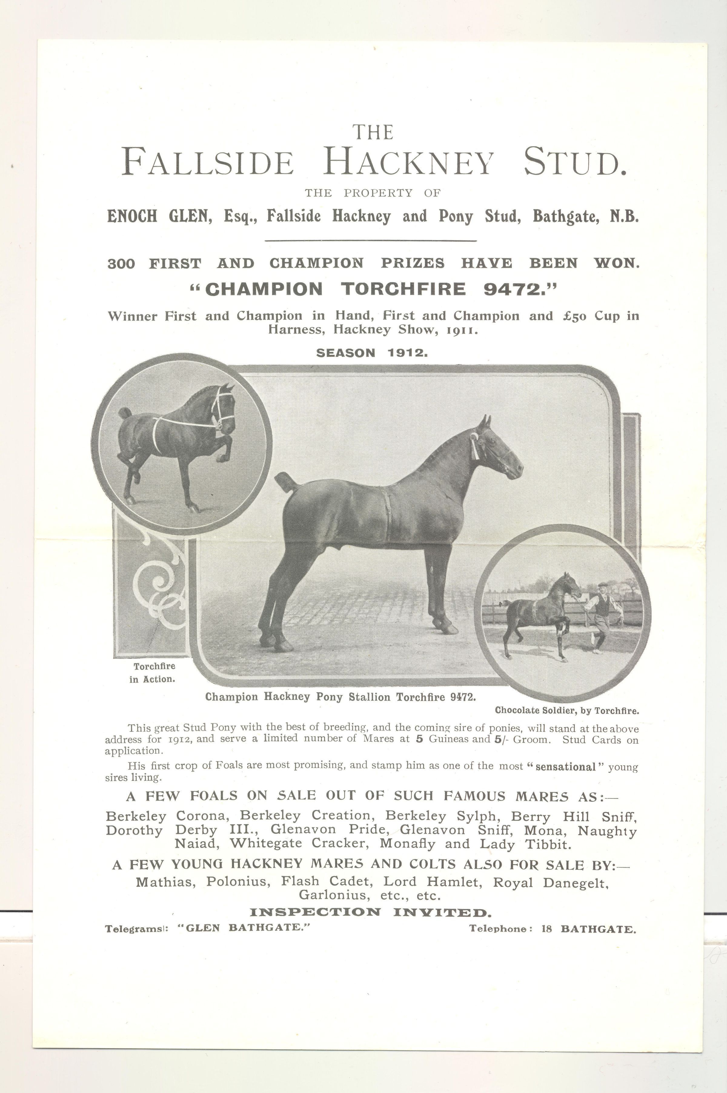 BROADSIDE, 1912, HORSE, ENGLAND. "TORCHFIRE" THE FALLSIDE HACKNEY STUD. PHOTOS, FOALS ON SALE. 6 1/2" X 9 3/4"Created By