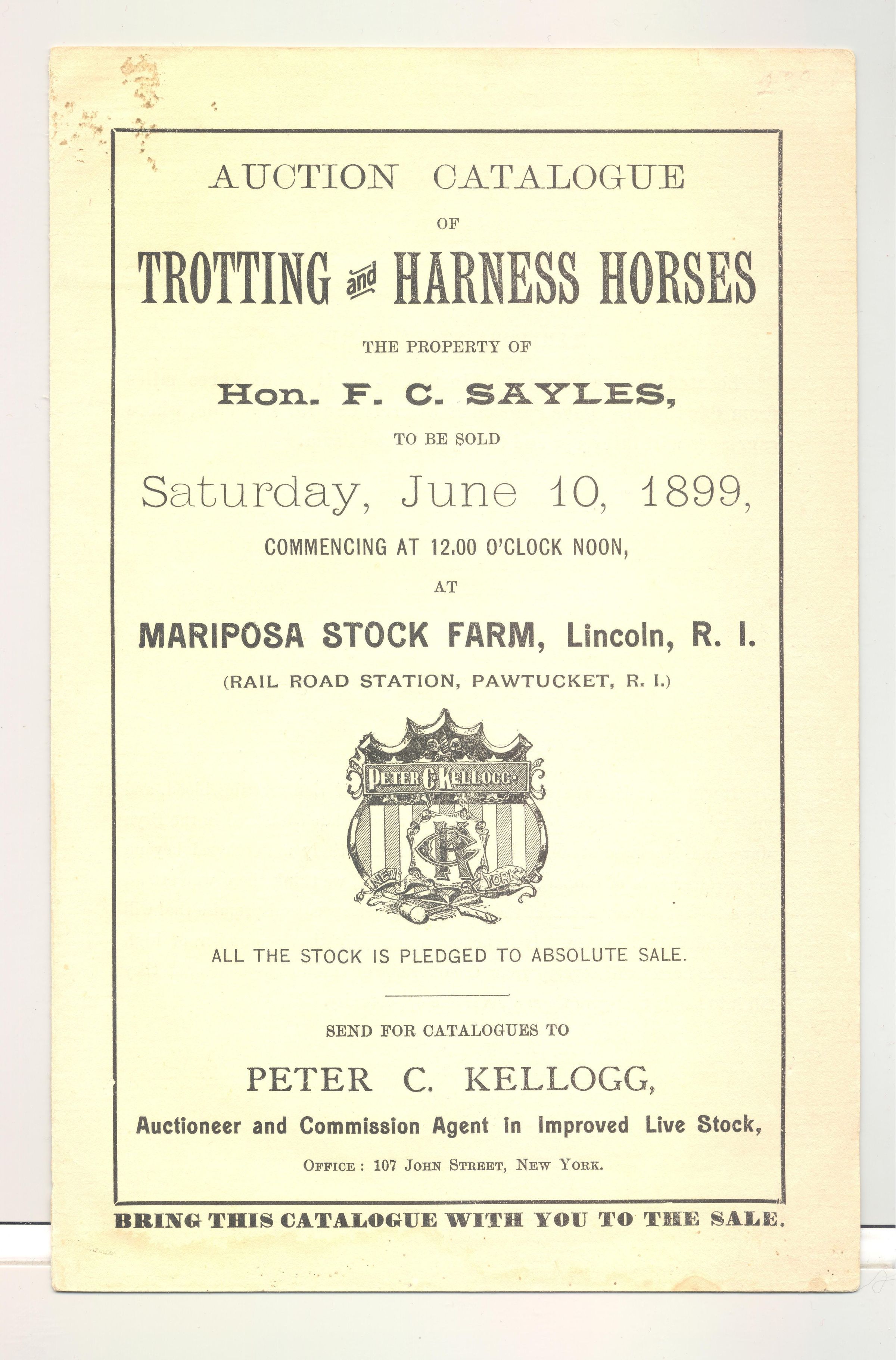 CAT, HORSE, 1899, RI. ABSOLUTE SALE OF TROTTING & HARNESS HORSES. PETER C. KELLOGG, AUCTIONEER. 9 PP. 5 7/8" X 9"Created By