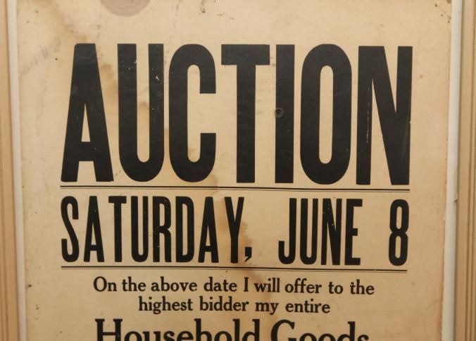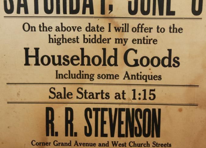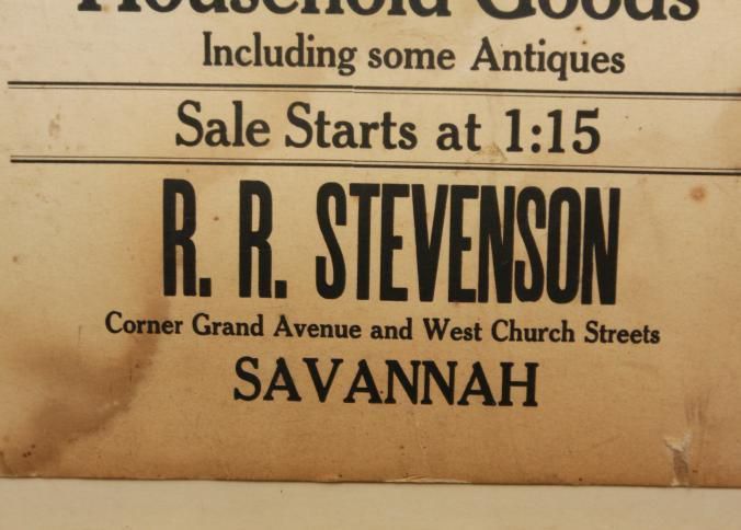 FR. EARLY 20THC GA. HOUSEHOLD & ANTIQUES AUCTION BROADSIDE. 11X14". "AUCTION SATURDAY, JUNE 8TH, ON THE ABOVE DATE I WILL OFFER TO THE HIGHEST BIDDER MY ENTIRE HOUSEHOLD GOODS INCLUDING SOME ANTIQUES. SALE STARTS AT 1:15. R.R. STEVENSON, CORNER GRAND AVENUE AND WEST CHURCH STREETS SAVANNAH." SIMPLE AND TO THE POINT. NO STATE OR YEAR AS AUCTIONS WERE LOCAL AND SHORT NOTICE. I ASSUME GEORGIA BY "SAVANNAH"Created By