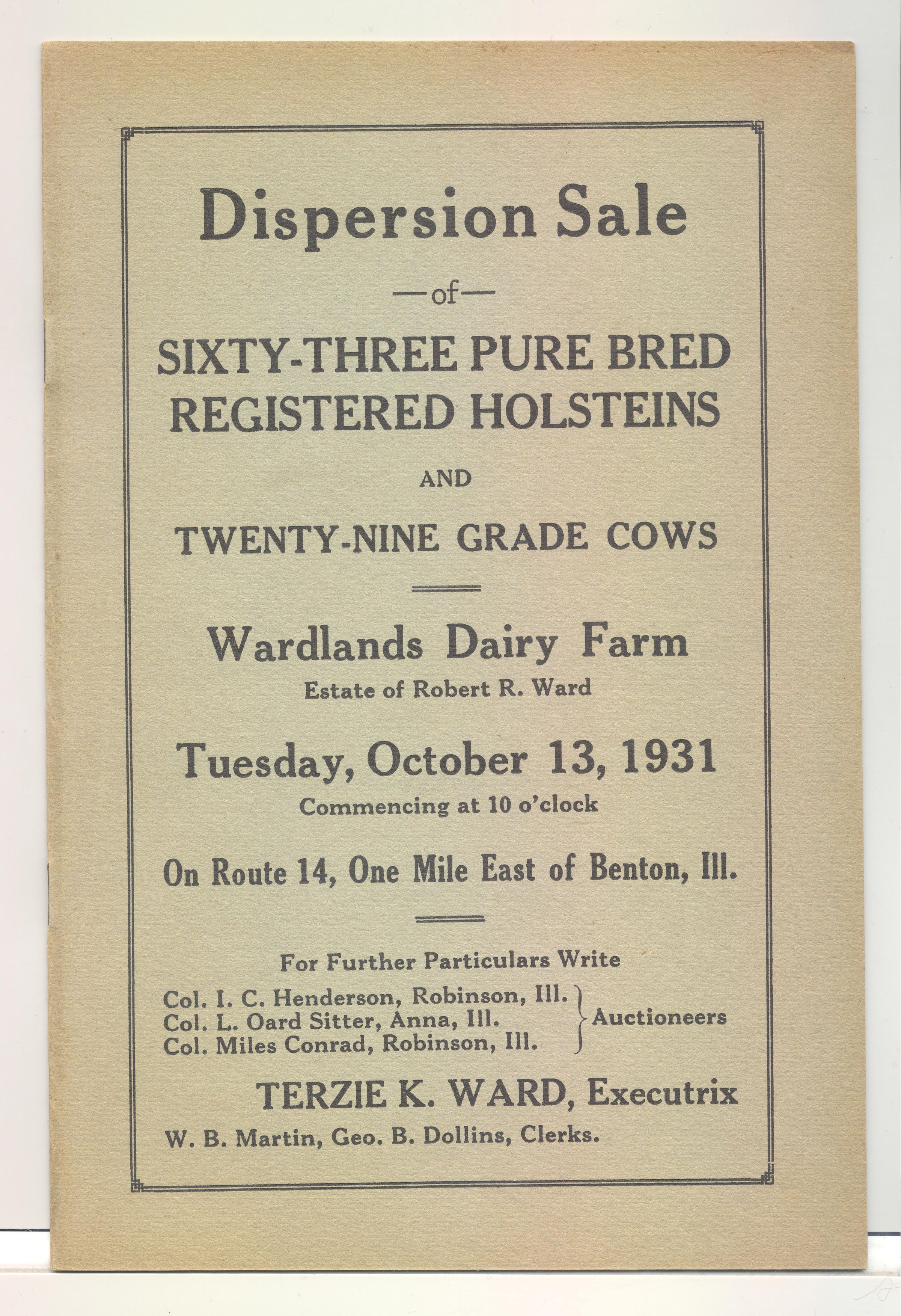 CAT, CATTLE, 1931, IL. DISPERSION SALE OF 63 PURE BRED REG. HOLSTEINS AND GRADE COWS. WARDLANDS DAIRY FARM. 4PP. 5 7/8" X 8 7/8"Created By