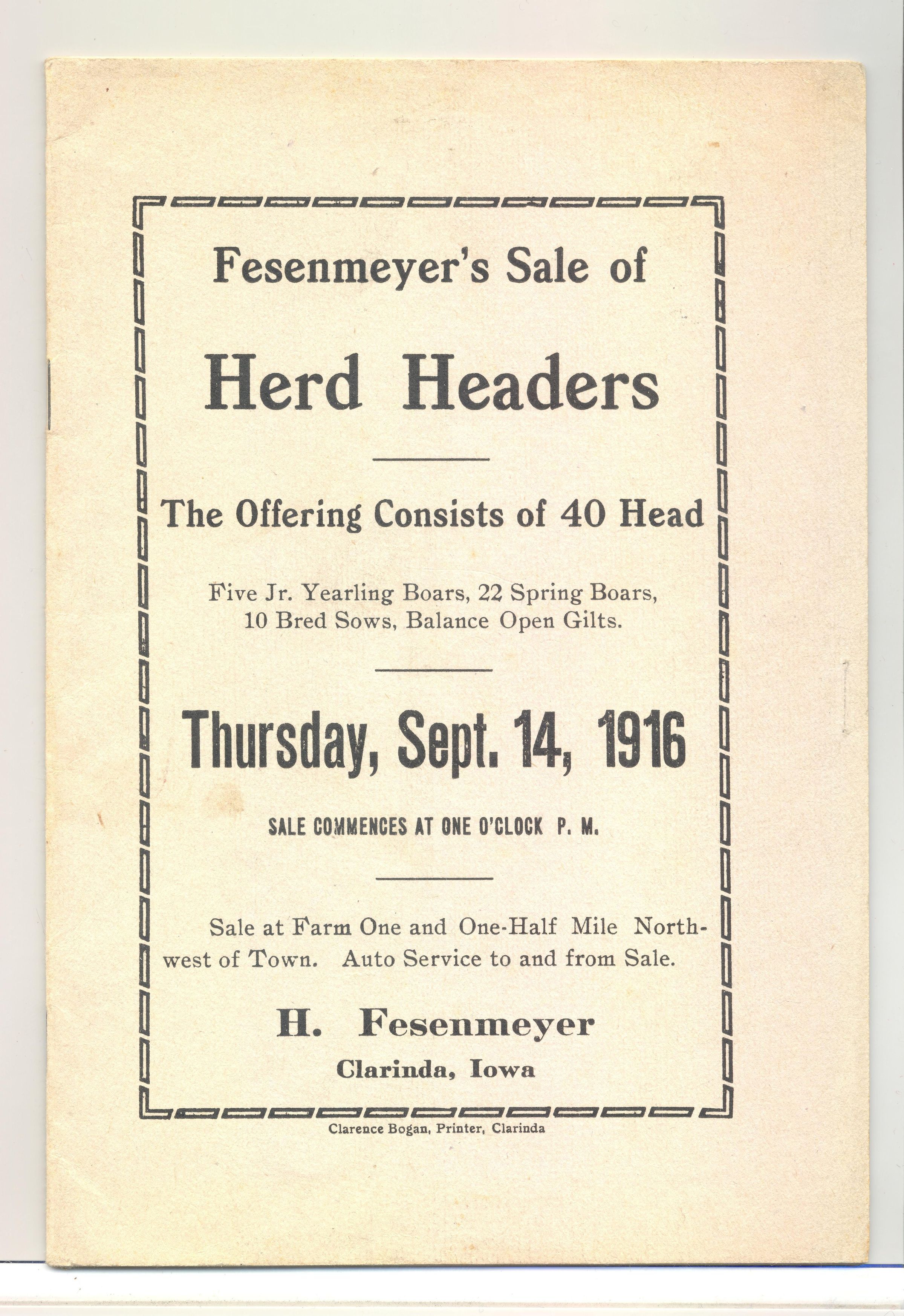 CAT, PIGS, 1916, IA. FESENMEYER'S SALE OF HERD HEADERS. POLAND CHINA SALE. 24 PP 5 3/4" X 8"