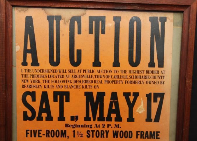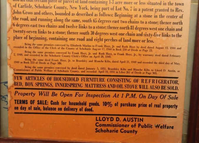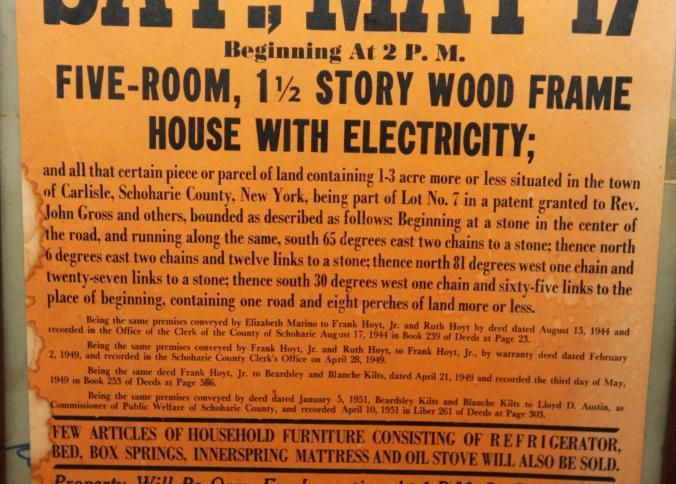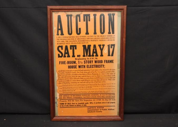 FR. 1951 NY MUNICIPAL REAL ESTATE AUCTION BROADSIDE. 11X17". THIS AUCTION WAS CONDUCTED BY LOYD D. AUSTIN COMMISSIONER OF PUBLIC WELFARE SCHOHARIE COUNTY, NY ON SATURDAY MAY 17TH. HE OFFERED A FIVE ROOM, 1 1/2 STORY WOOD FRAME HOUSE WITH ELECTRICITY. AUCTION WAS SCHEDULED FOR 2PM. ALITTLE PERSONAL PROPERTY WOULD ALSO BE SOLD.Created By
