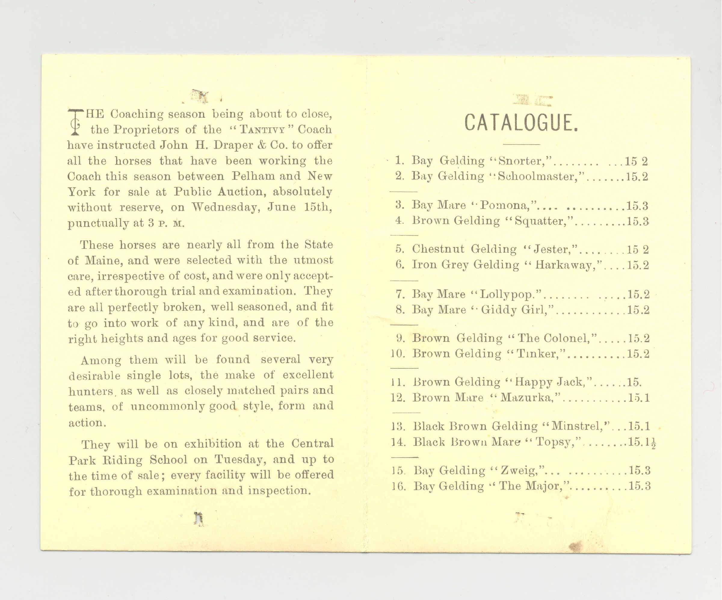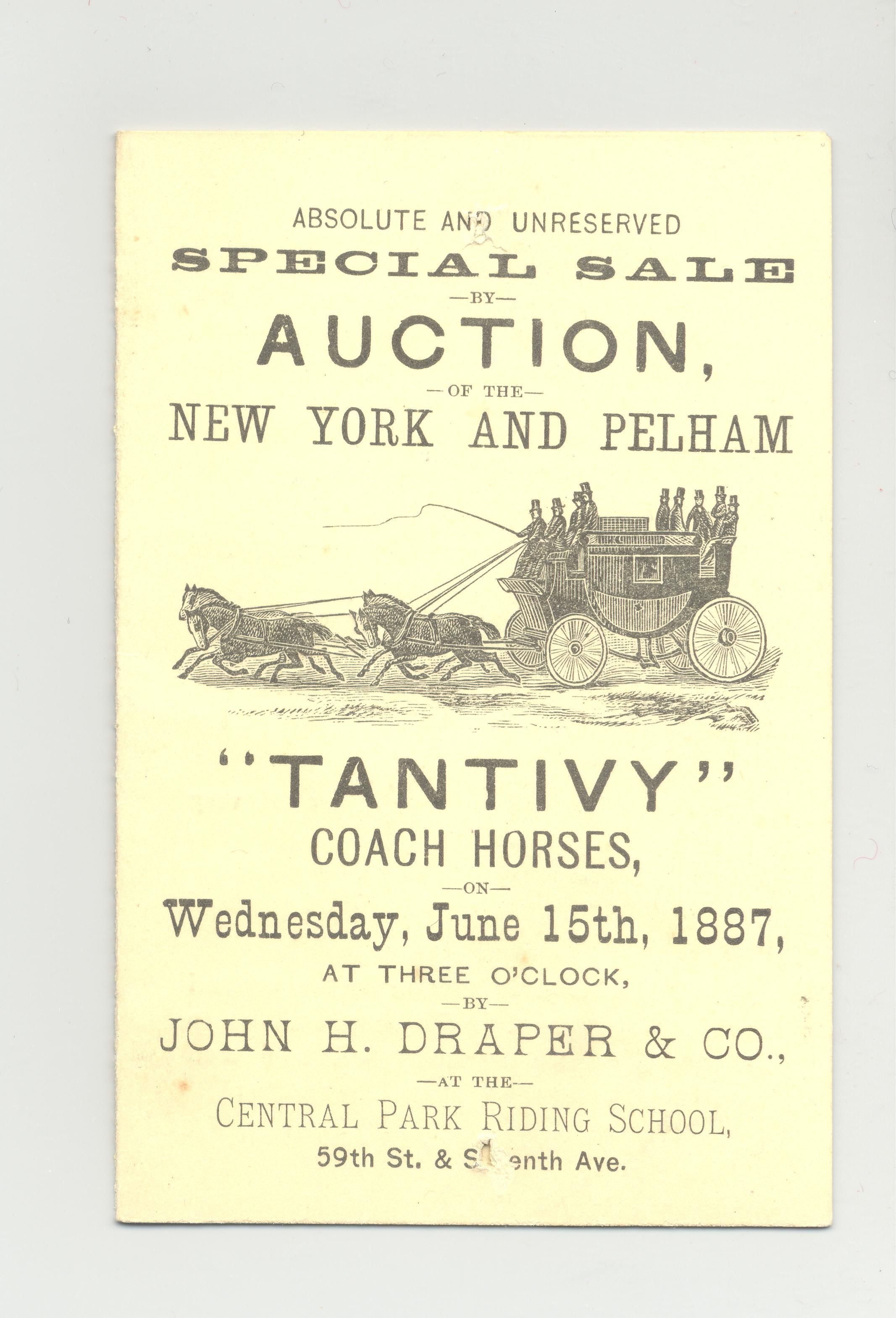 CAT, HORSE, 1887, NY. ABSOLUTE AND UNRESERVED SPECIAL SALE OF THE NY AND PELHAM "TANTIVY" COACH HORSES. CENTRAL PARK RIDING SCHOOL. PRICES WRITTEN 2 7/8" X 4 3/8"Created By