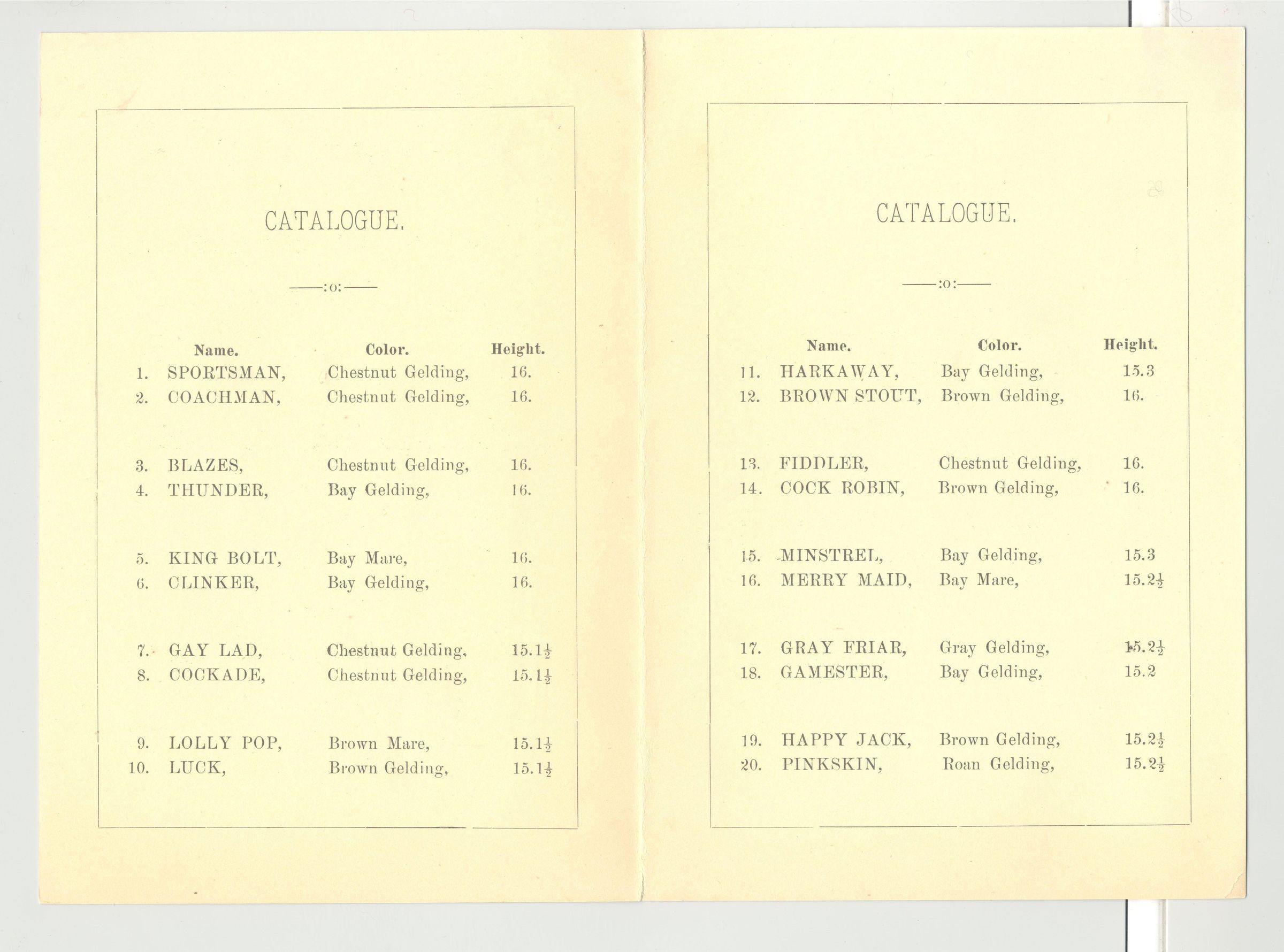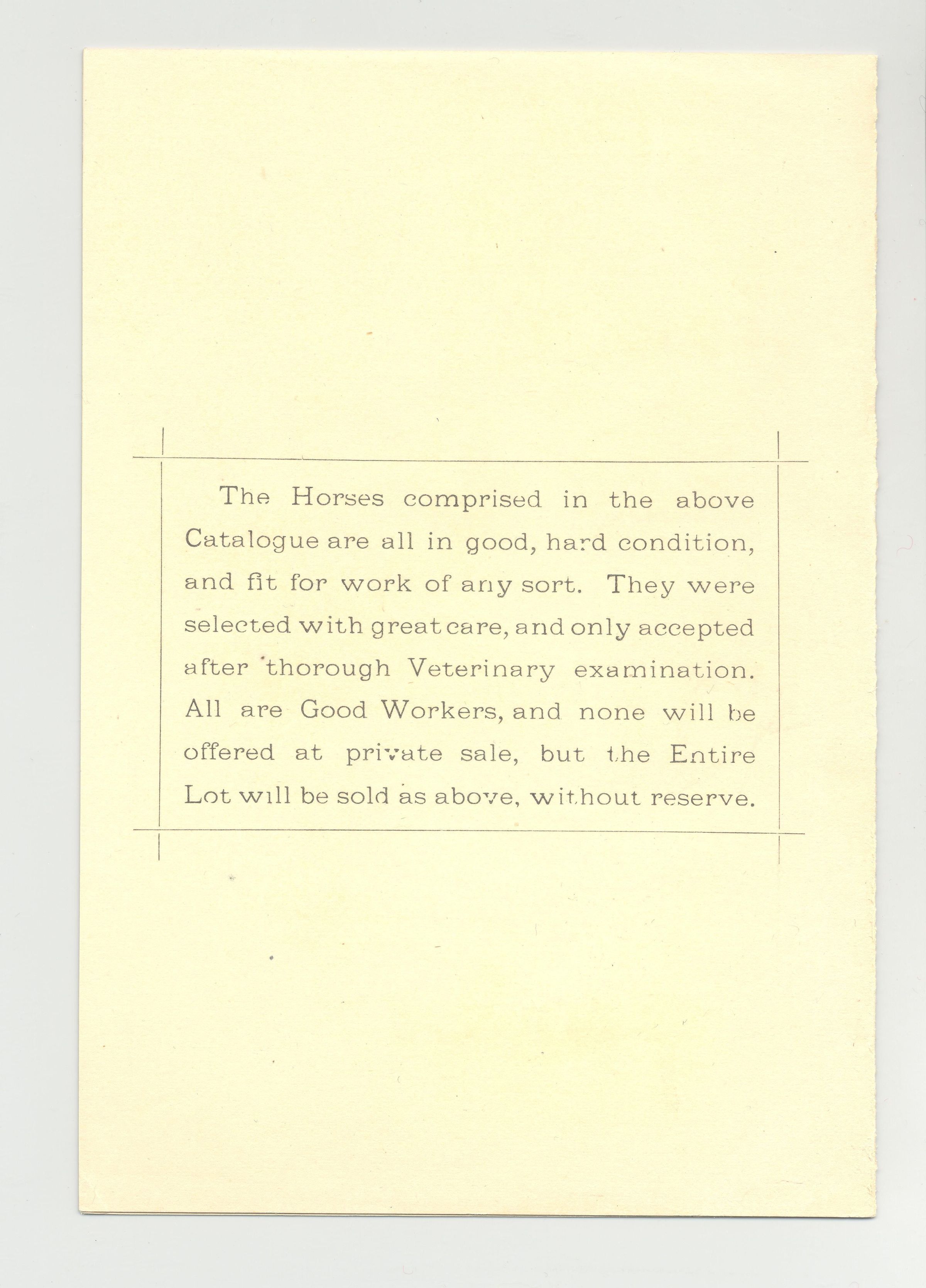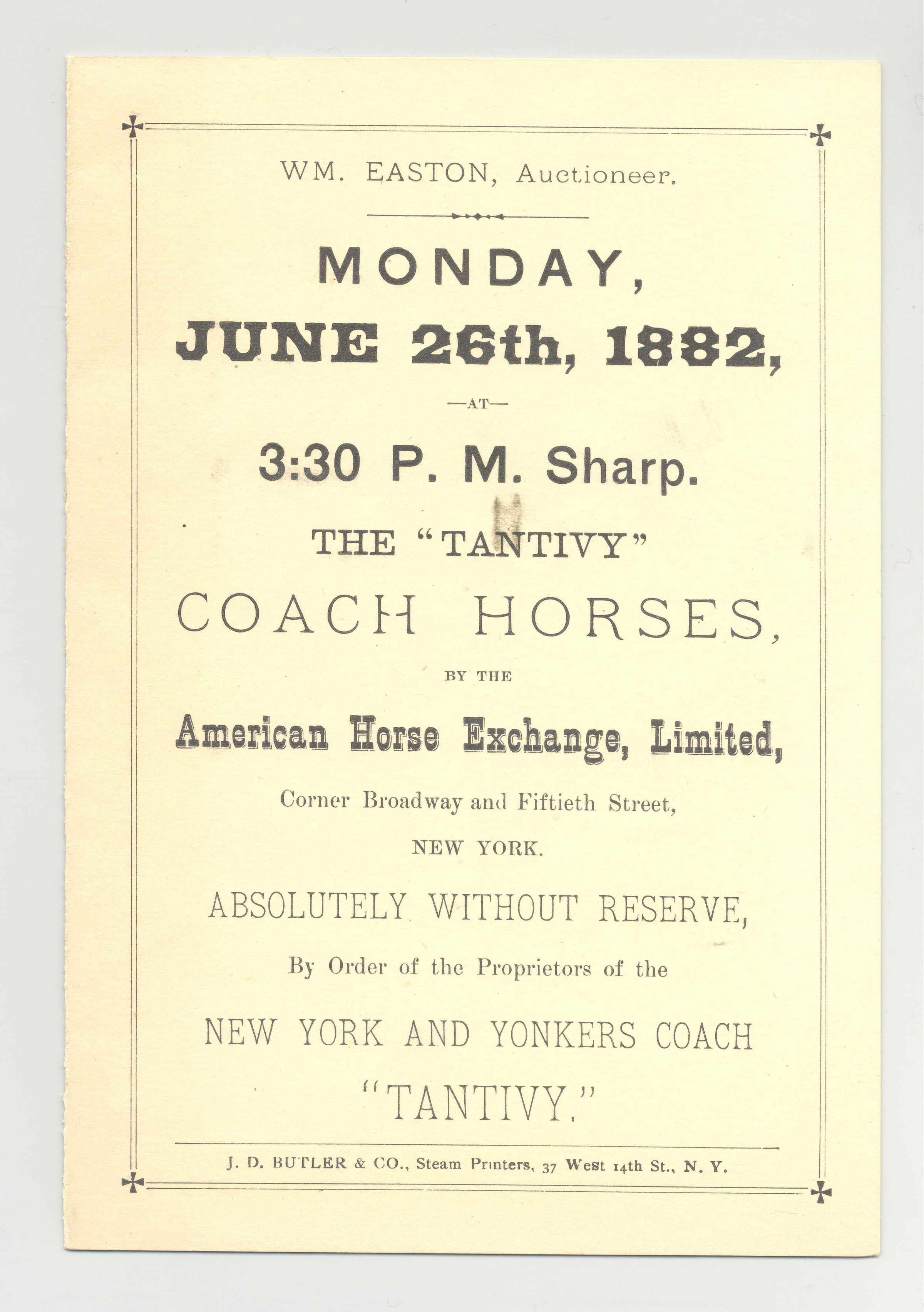 CAT, HORSE, 1882, NY. WM. EASTON, AUCT. THE "TANTIVY" COACH HORSES BY THE AMERICAN HORSE EXCHANGE, LTD. UNRESERVED. 4 3/4" X 6 3/4"Created By