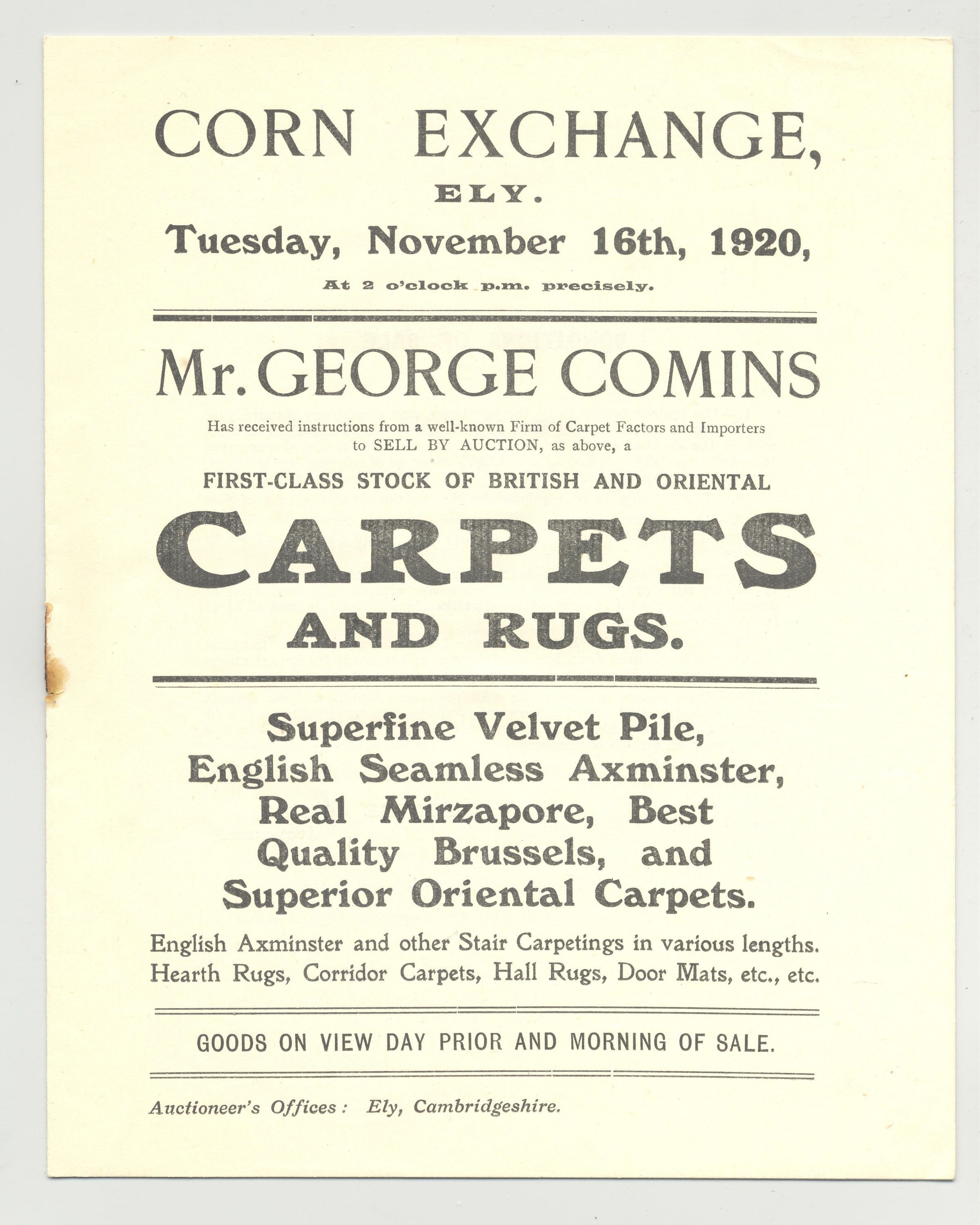 CAT, 1920, RUGS, CAMBRIDGESHIRE, ENGLAND. BRITISH AND ORIENTAL CARPETS AND RUGS. 7 PP, 6 1/2" X 8"Created By
