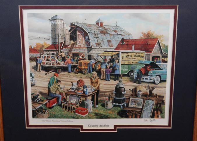 FR. CONTEMPORARY"COUNTRY AUCTION" PRINT. 9X11" PRINT DOUBLE MATTED AND FRAMED IN OAK TO 18 1/2X16 1/2". THIS VERY DETAILED ON-SITE AUCTION SCENE PRINT IS SIGNED "KEN ZYLLA" AND IS "THE CLASSIC AMERICAN ENCORE EDITION". FANTASTIC COLOR AND DETAIL.Created By