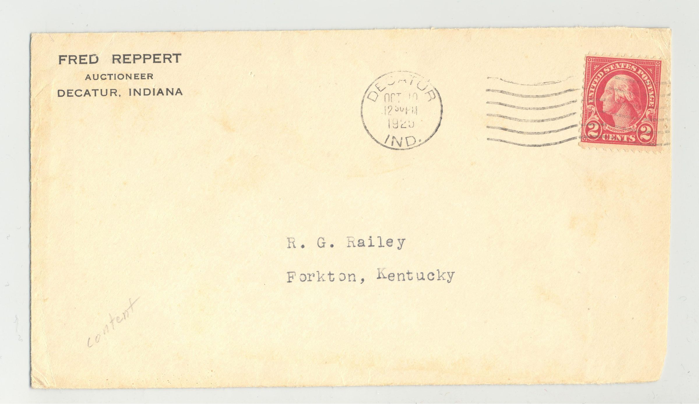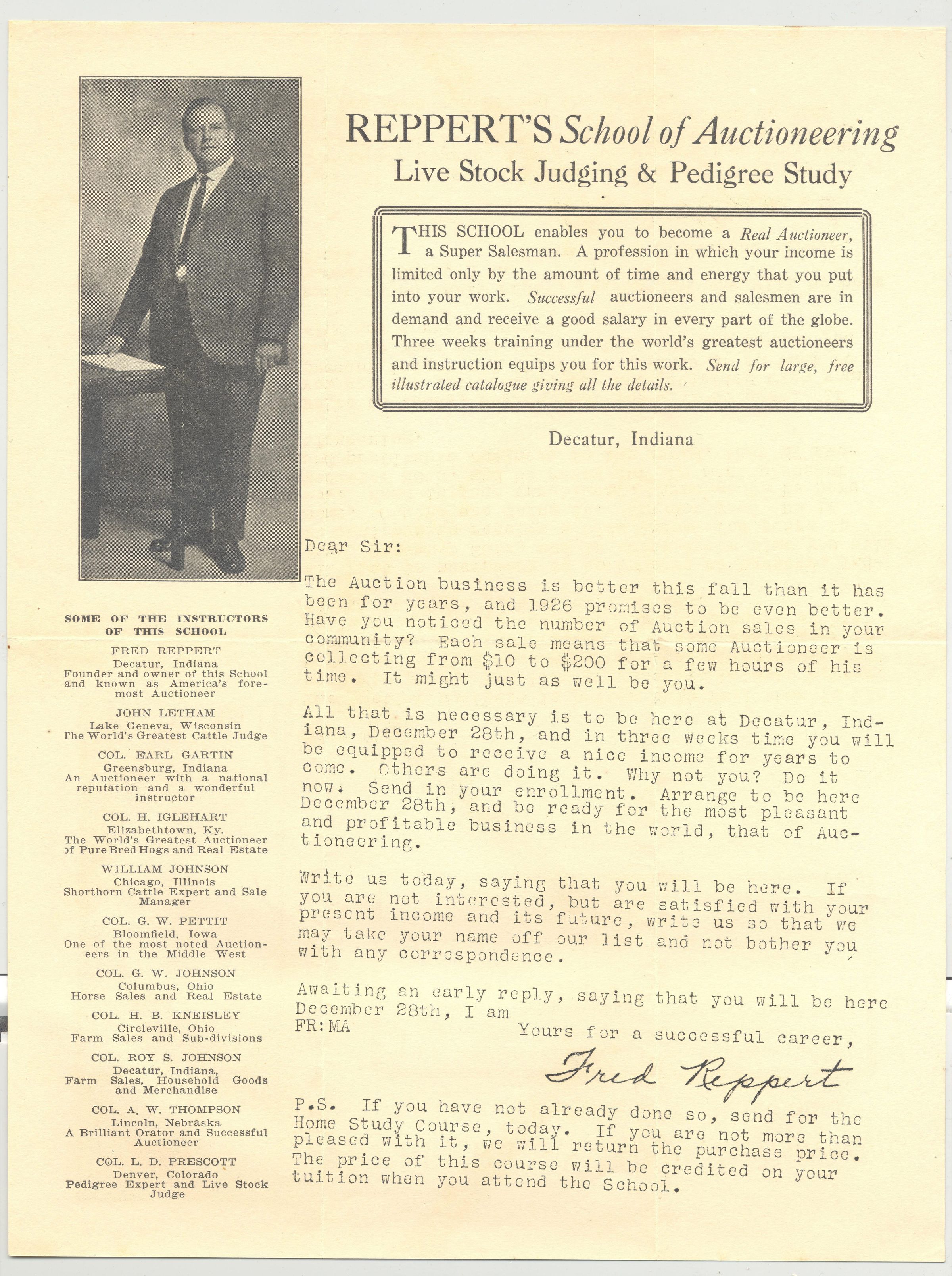 LETTER, ENV. AUCTION SCHOOL, 1926, IN. REPPERT'S SCHOOL OF AUCTIONEERING LIVE STOCK JUDGING AND PEDIGREE STUDY.Created By