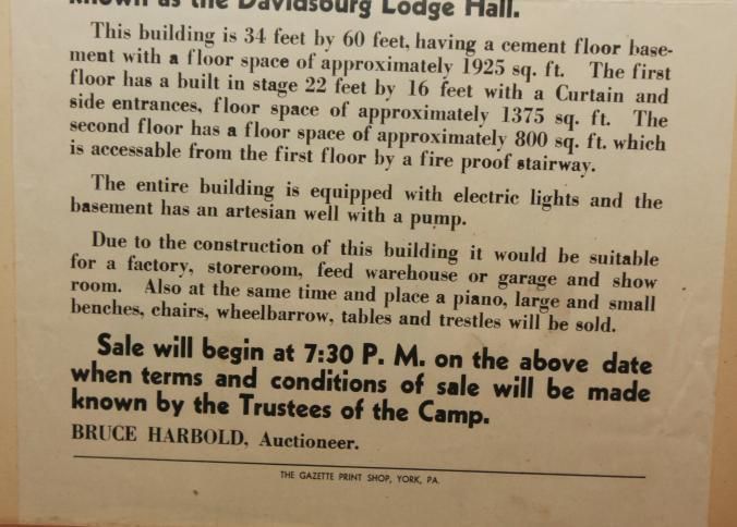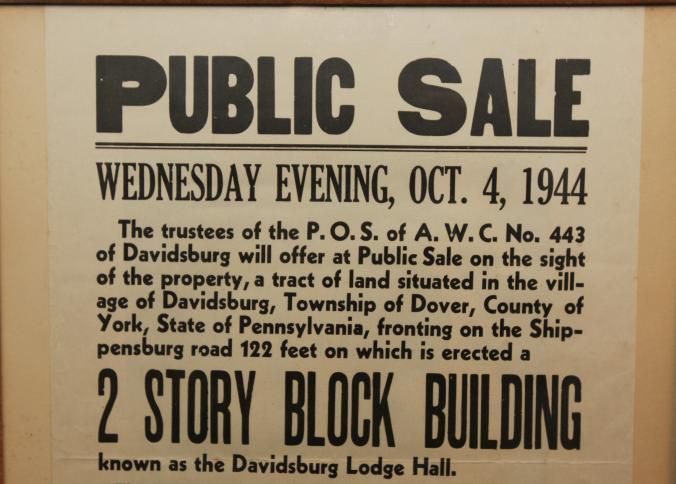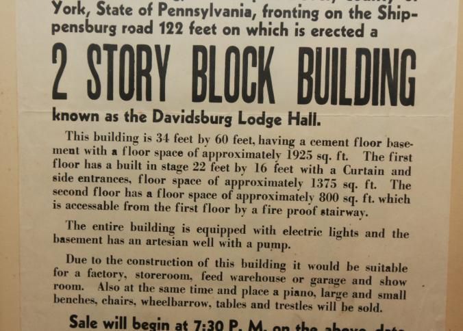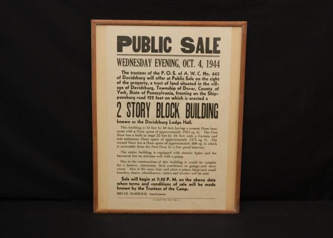 FR. 1944 PA. REAL ESTATE AUCTION BROADSIDE. 11X15 1/2". AUCTIONEER BRUCE HARBOLD WAS SELLING THE "DAVIDSBURG LODGE HALL" BY ORDER OF THE TRUSTEES OF THE CAMP ON WED. EVENING OCT. 4TH 1944. THE AUCTION TOOK PLACE IN THE VILLAGE OF DAVIDSBURG, COUNTY OF YOR, STATE OF PENNSYLVANIA ON SHIPPENSBURG RD. AUCTION WAS TO HAPPEN AT 7:30PM. VERY DETAILED DESCRIPTION.Created By