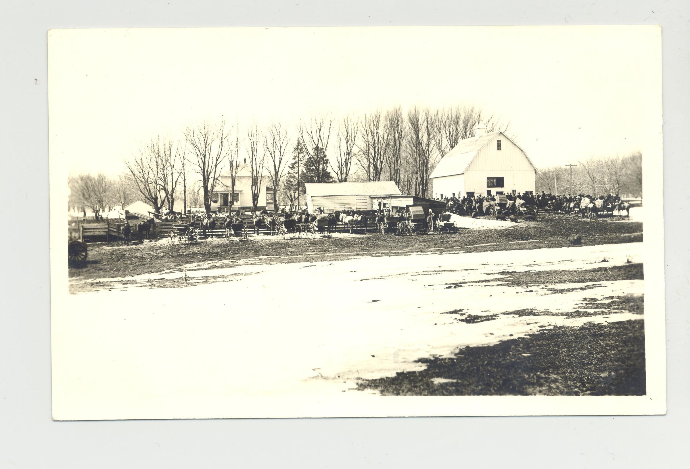 PSTCD, FARM, LANCASTER, WI. B/W PHOTO WINTER FARM, HORSE & BUGGIES.