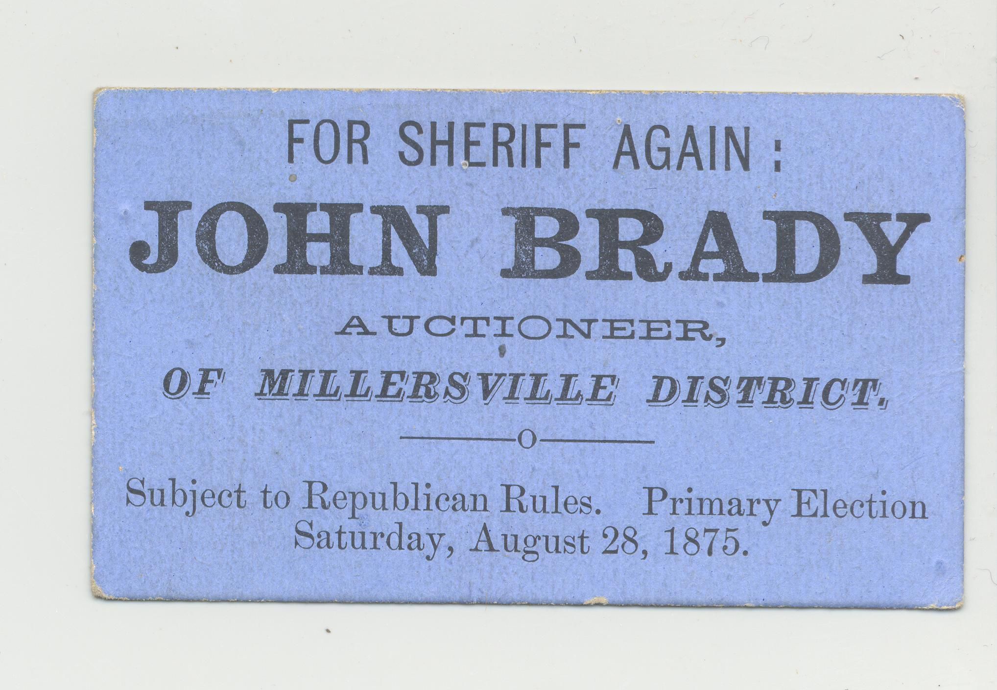 BSCD, 1875, "FOR SHERIFF AGAIN: JOHN BRADY, AUCTIONEER OF MILLERSVILLE DISTRICT." SUBJECT TO REPUBLICAN RULES. PRIMARY ELECTION.Created By