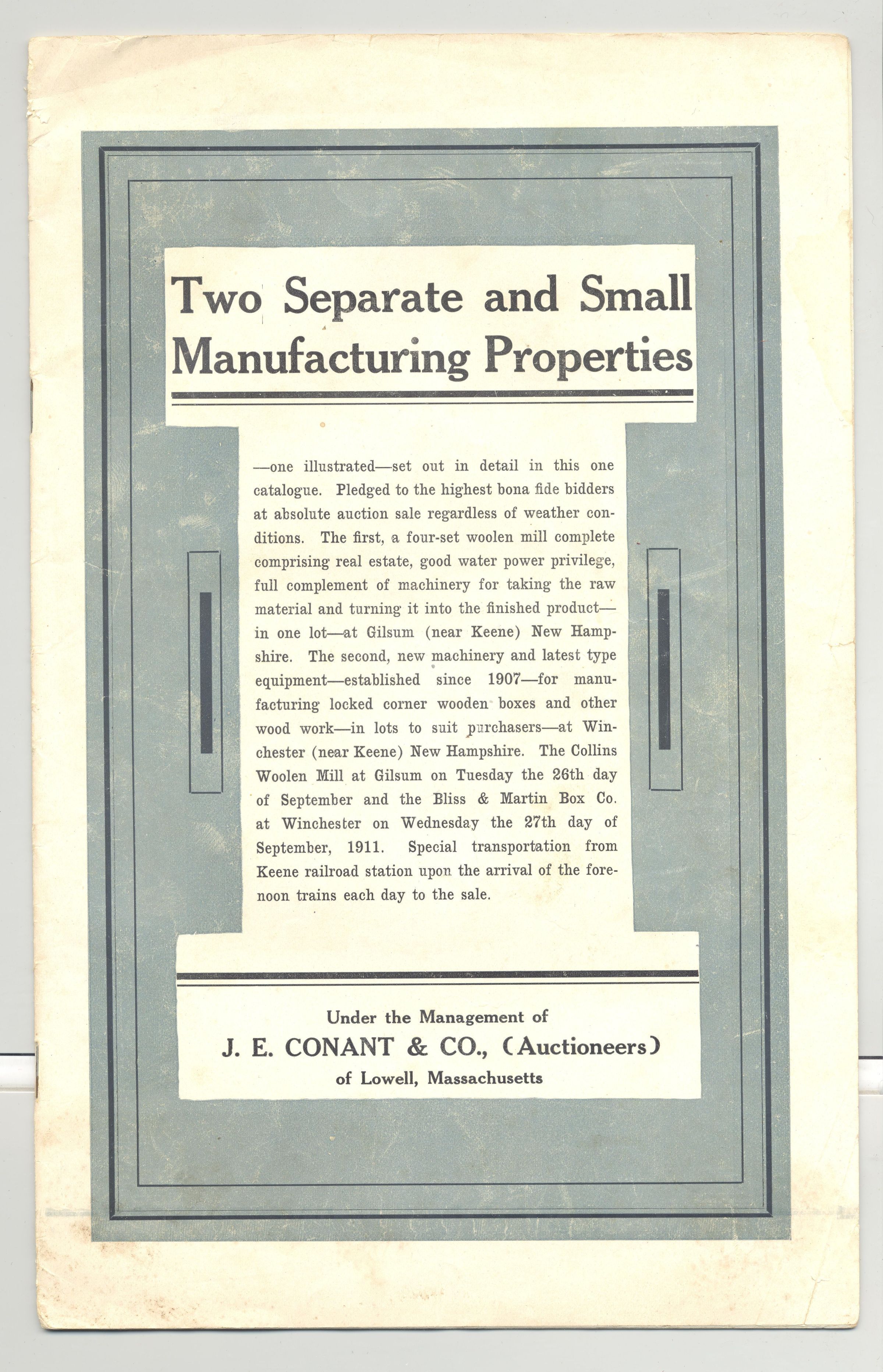 CAT, 1911, REAL ESTATE, MA. "TWO SEPARATE AND SMALL MANUF. PROPERTIES" J.E. CONANT & CO AUCTIONEERS. 23 PP. 7" X 11"Created By