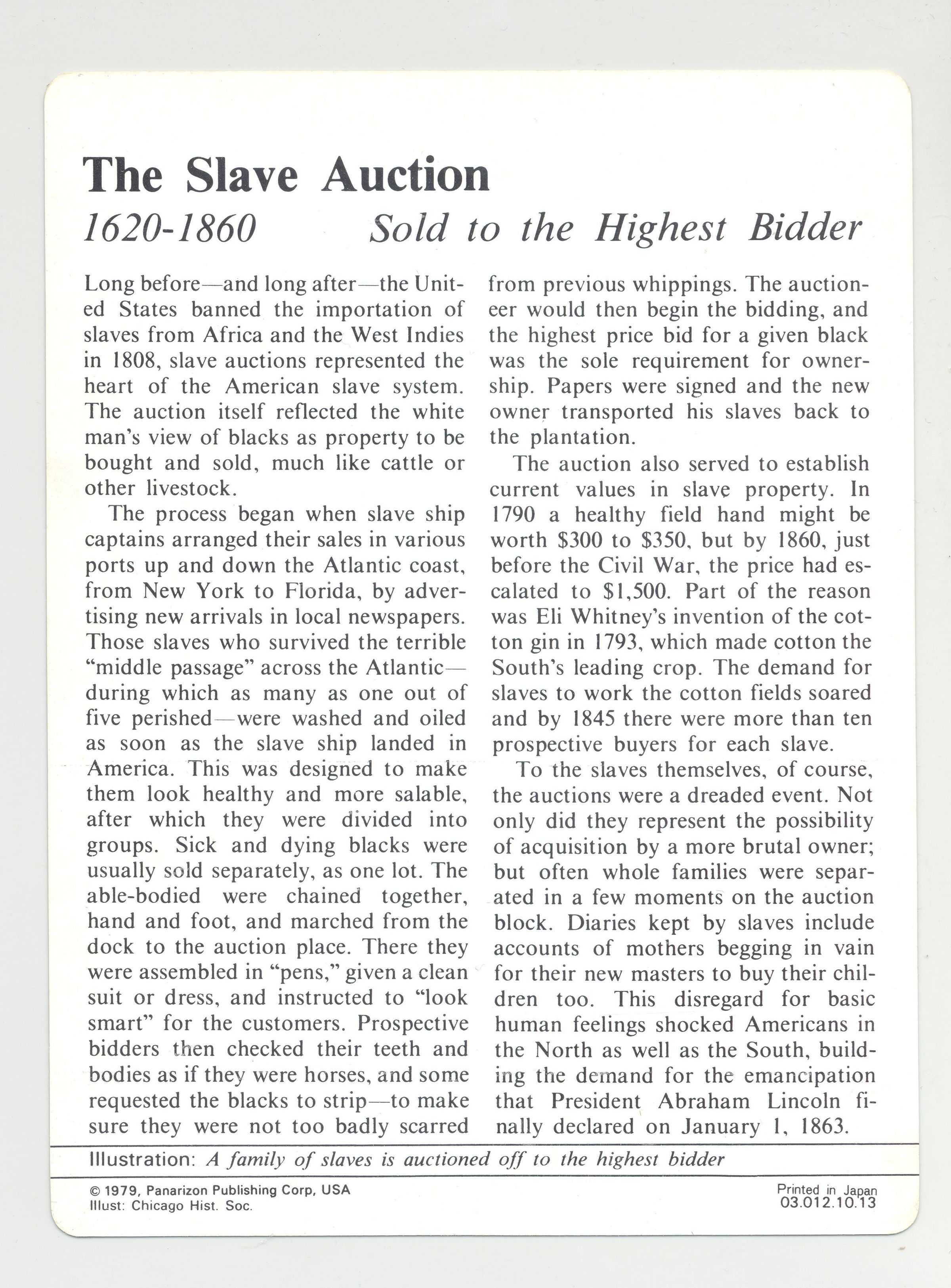 CARD & ILLUSTRATION, PUBL. 1979, ILLUS. CHICOGO HIST. SOC. "THE SLAVE AUCTION 1620 - 1860, SOLD TO THE HIGHEST BIDDER" HISTORICAL ACCOUNT OF SLAVERY.Created By