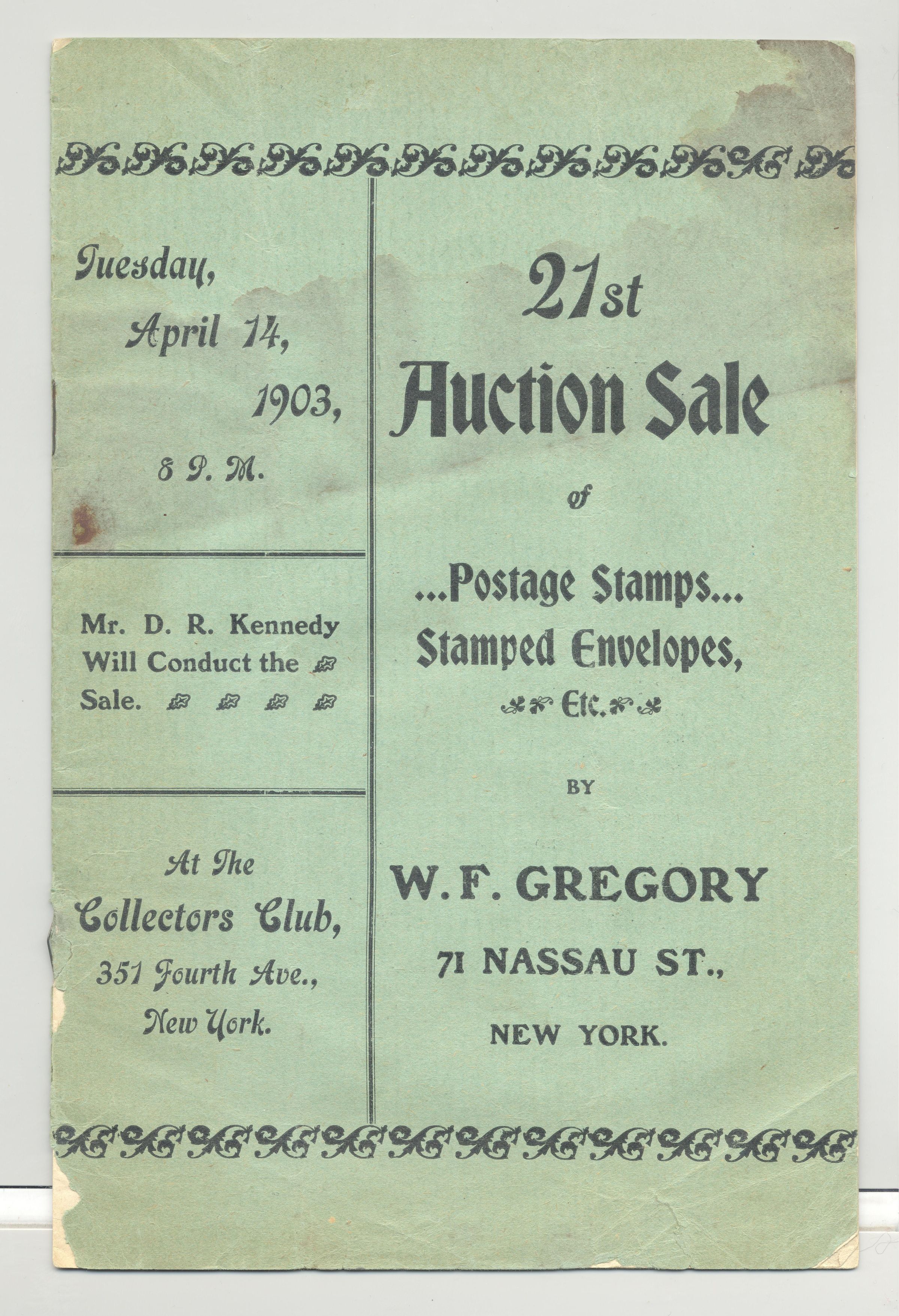 CAT, STAMPS, 1903, NY. "21ST AUCTION SALE" AT THE COLLECTORS CLUB. 16 PP. 6" X 9"