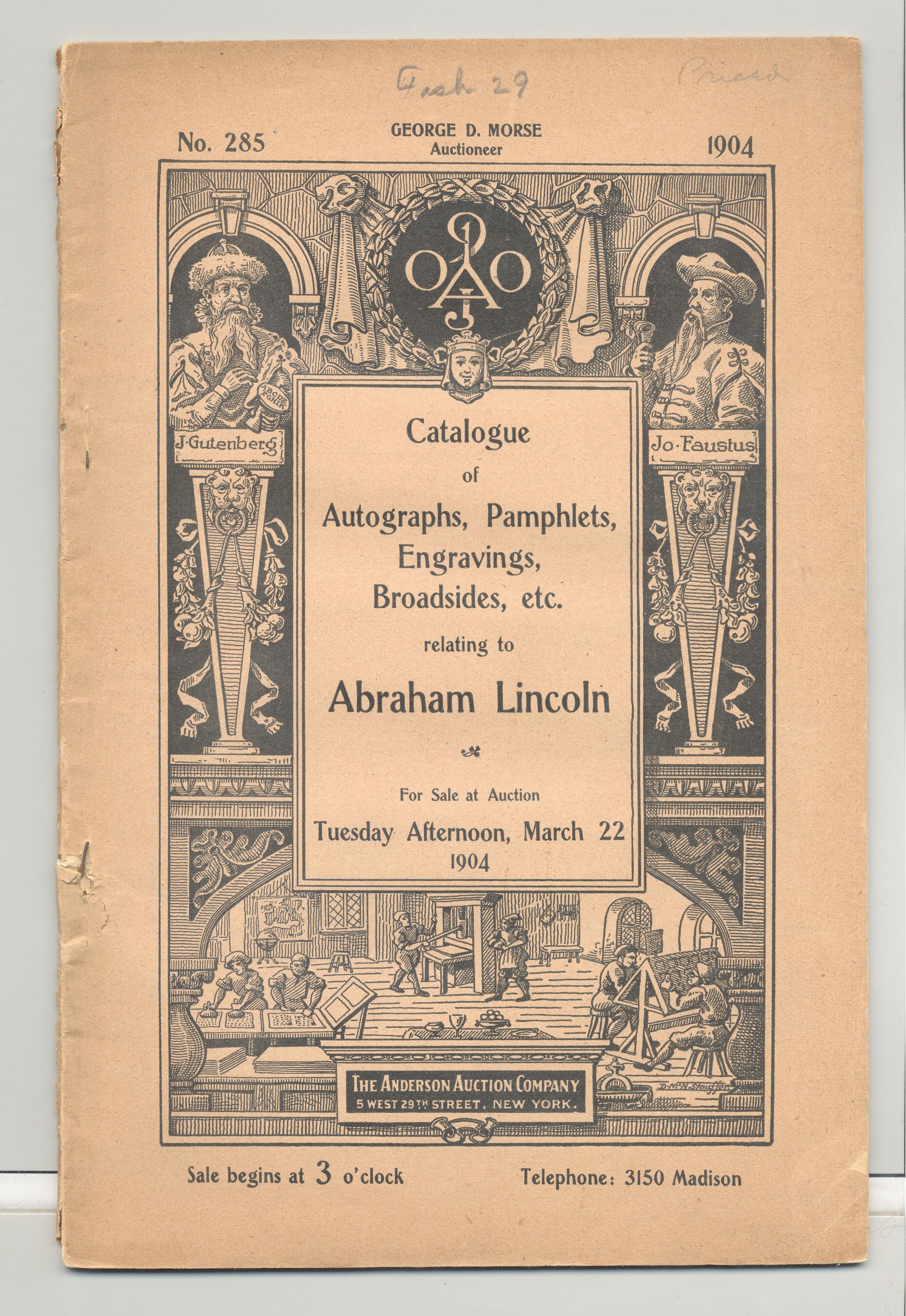 CAT, HISTORICAL PAPERS, ENGRAVINGS, RELATING TO ABRAHAM LINCOLN. 1904, NY. GEORGE MORSE, AUCT. THE ANDERSON AUCTION CO. 37 PP, 6" X 9"Created By