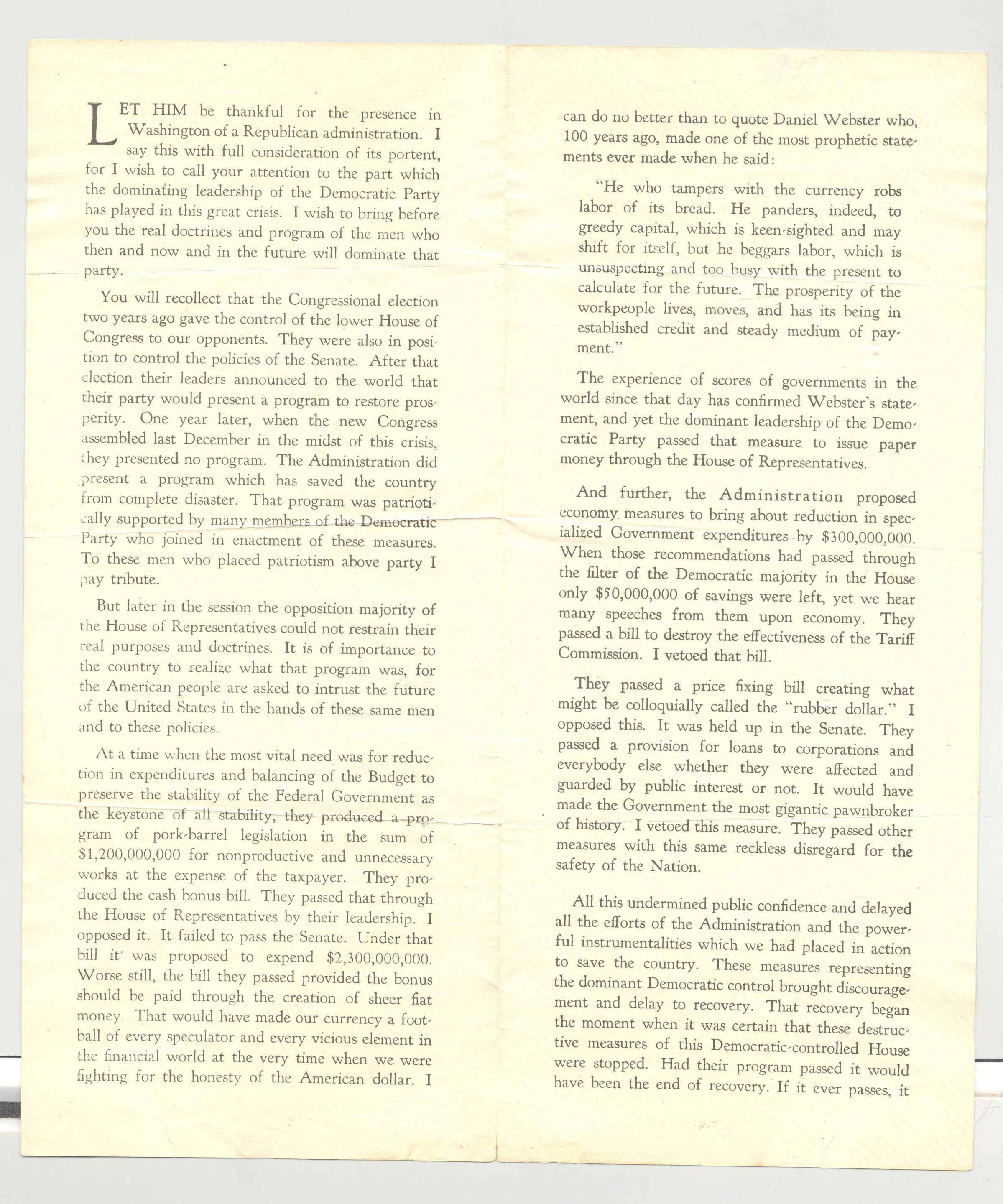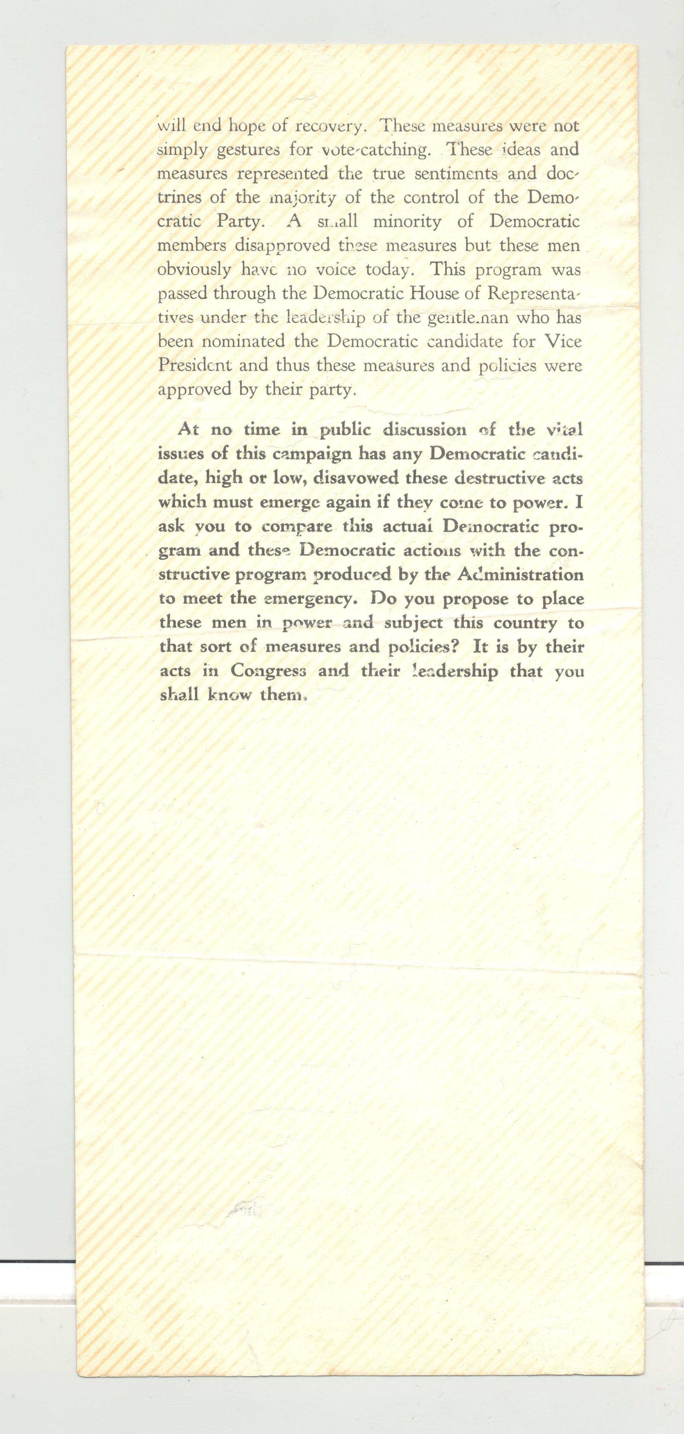 PAM, POLITICAL, 1932, IA. "BY THEIR FRUITS YE SHALL KNOW THEM" AN EXCERPT FROM THE ADDRESS OF THE PRESIDENT AT DES MOINES.." ISSUED BY THE REPUBLICAN NATIONAL COMMITTEE.Created By