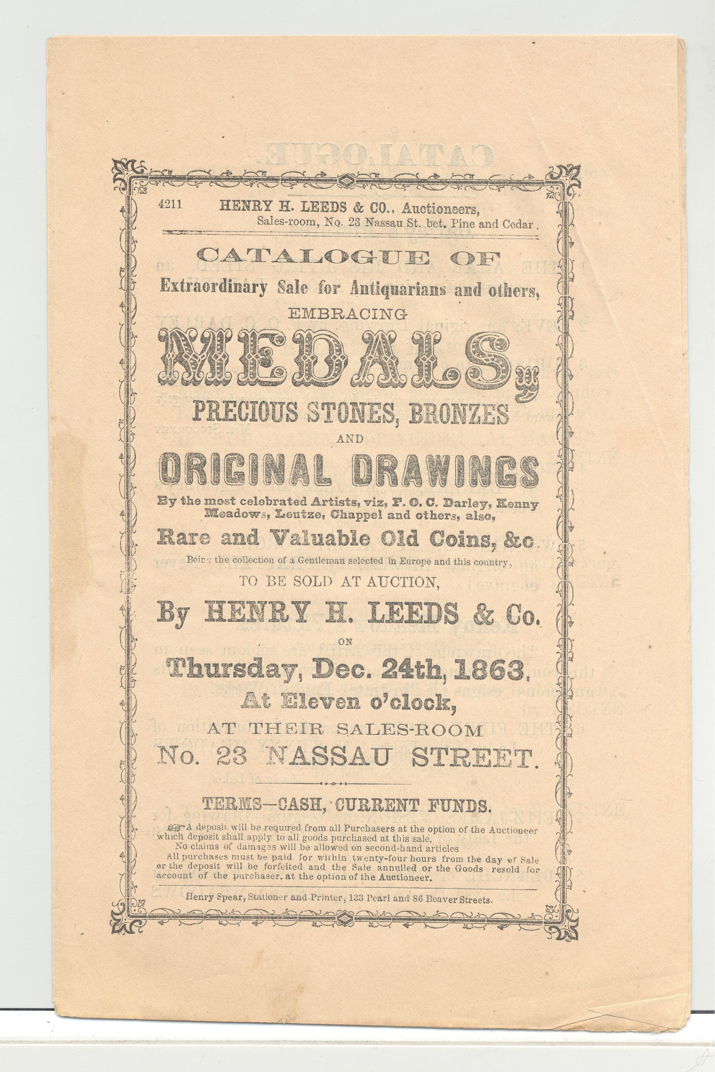 CAT, COINS, MEDALS, 1863. PRECIOUS STONES, BRONZES, DRAWINGS. HENRY LEEDS & CO AUCT. 8 PP. 5 1/2" X 8 1/2"Created By
