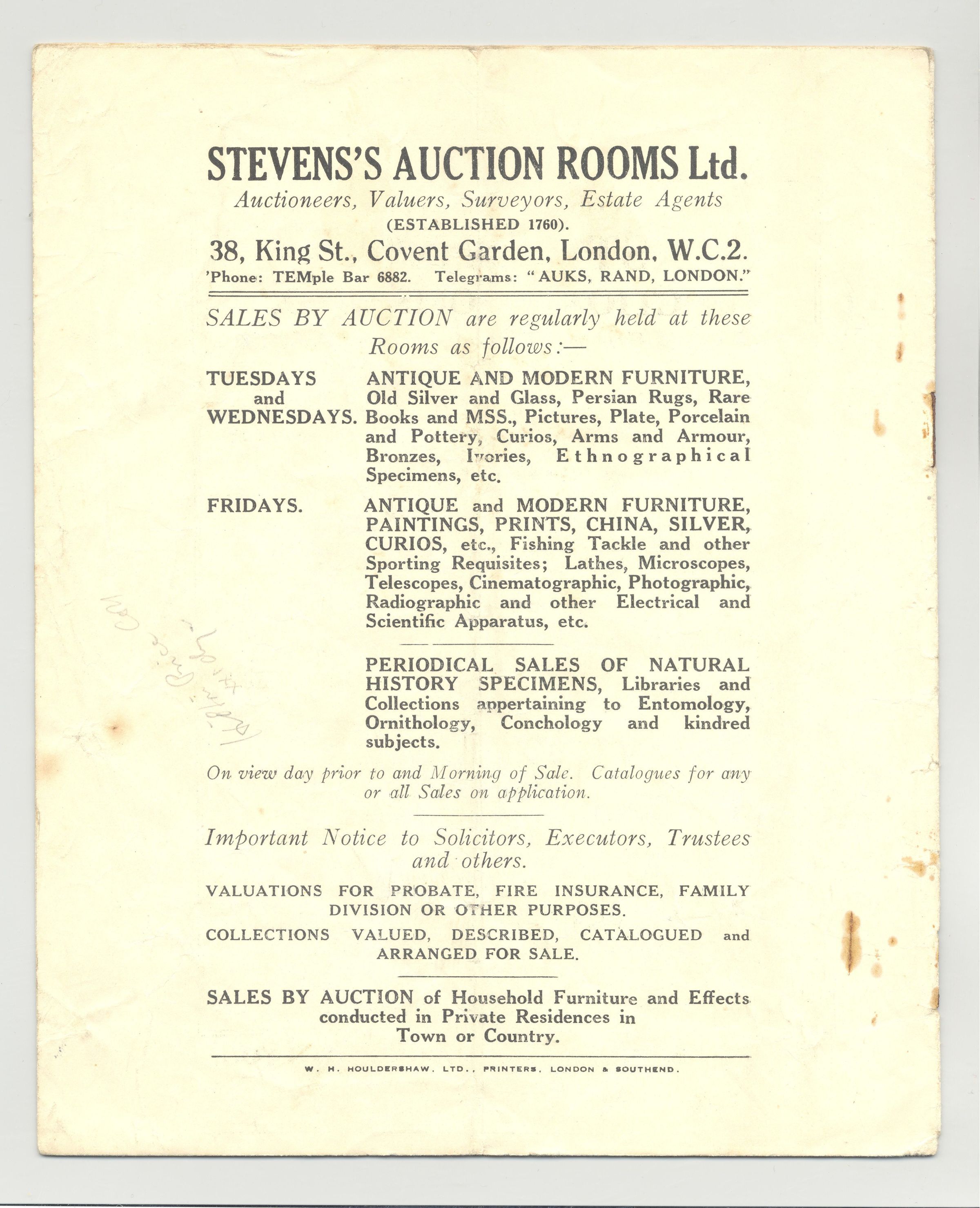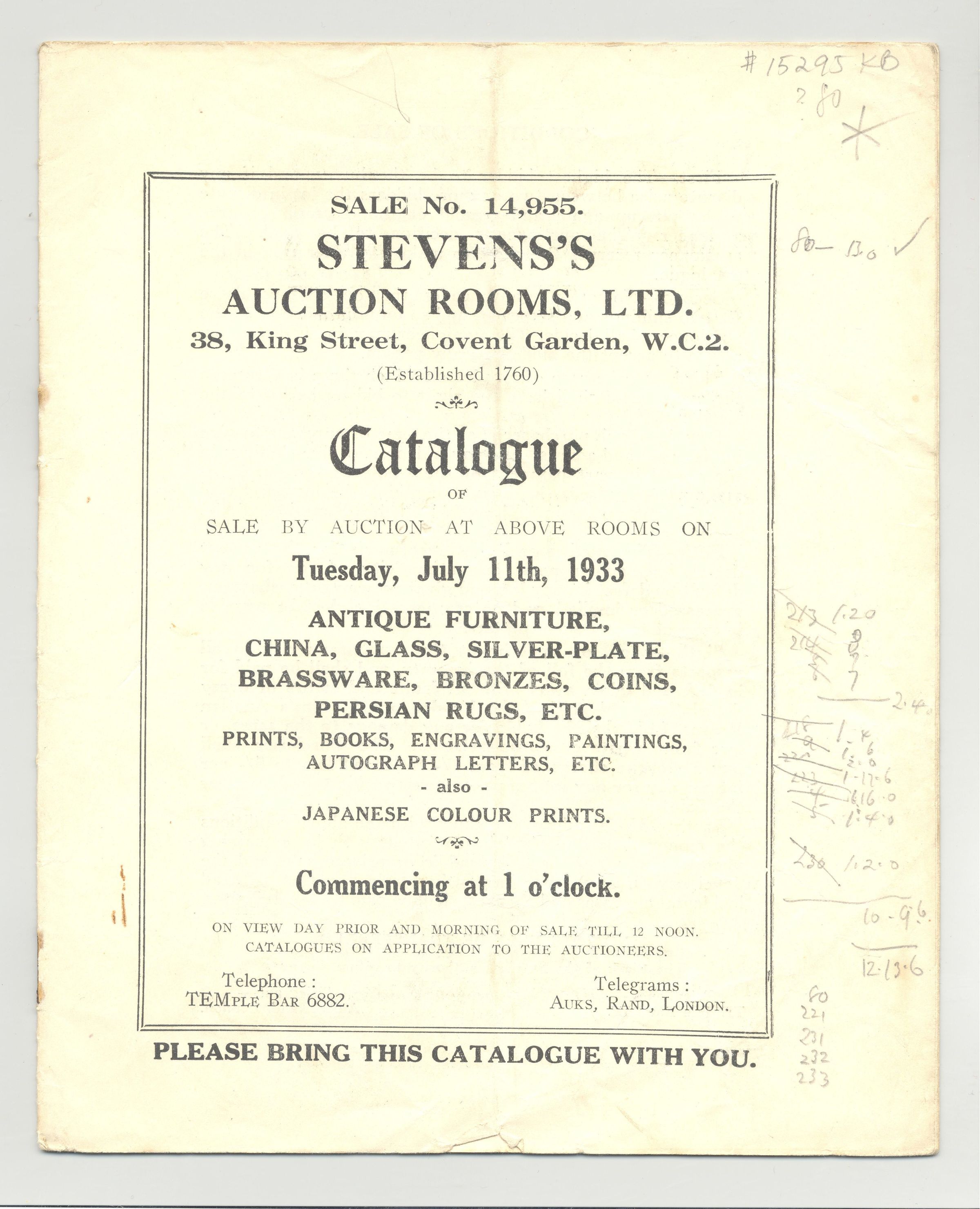 CAT, ANTIQUES, 1933, LONDON. STEVENS'S AUCTION ROOMS, LTD. 14 PP. 6 1/2" X 8"